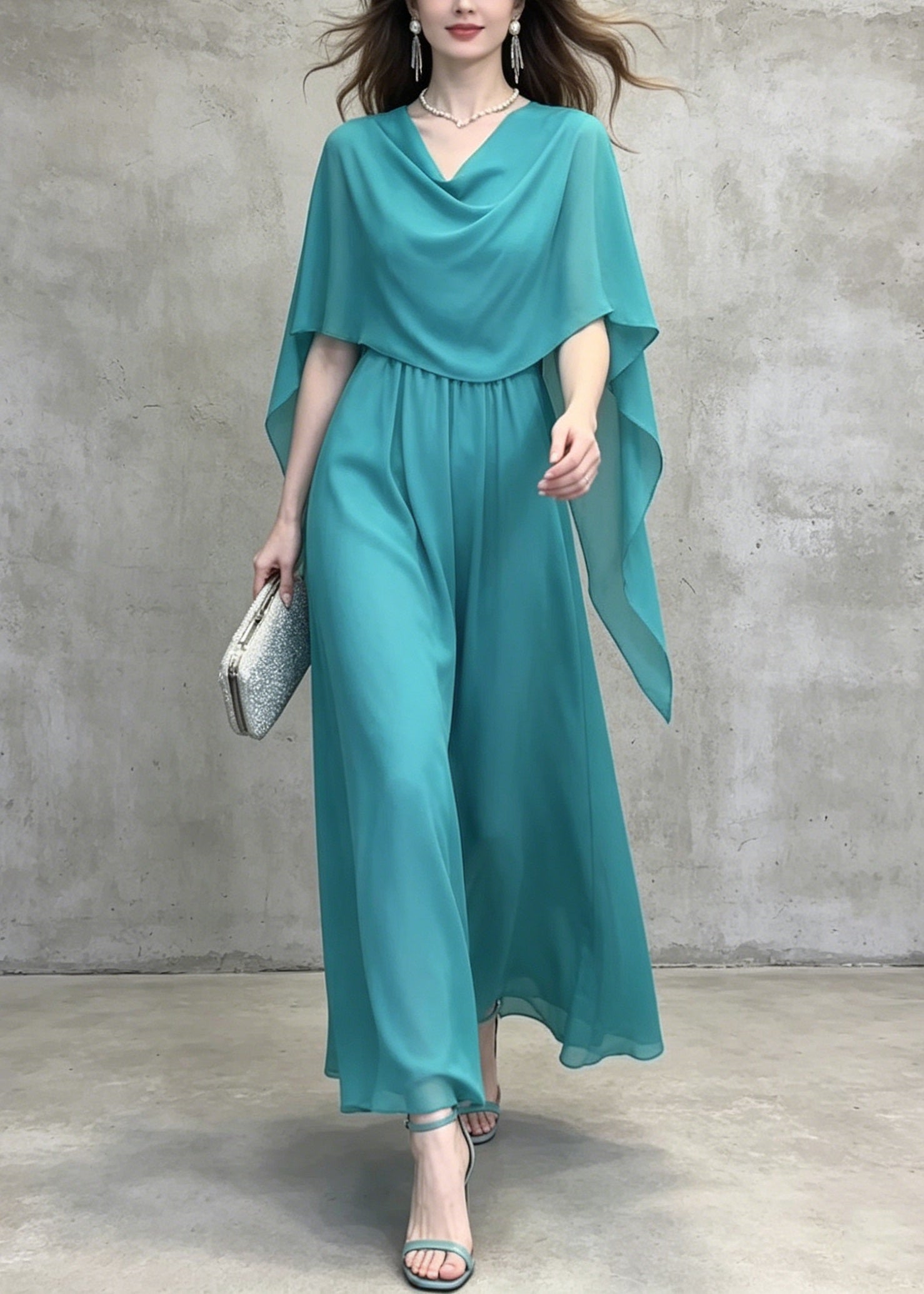 French Lake Blue Patchwork Chiffon Long Dress Summer