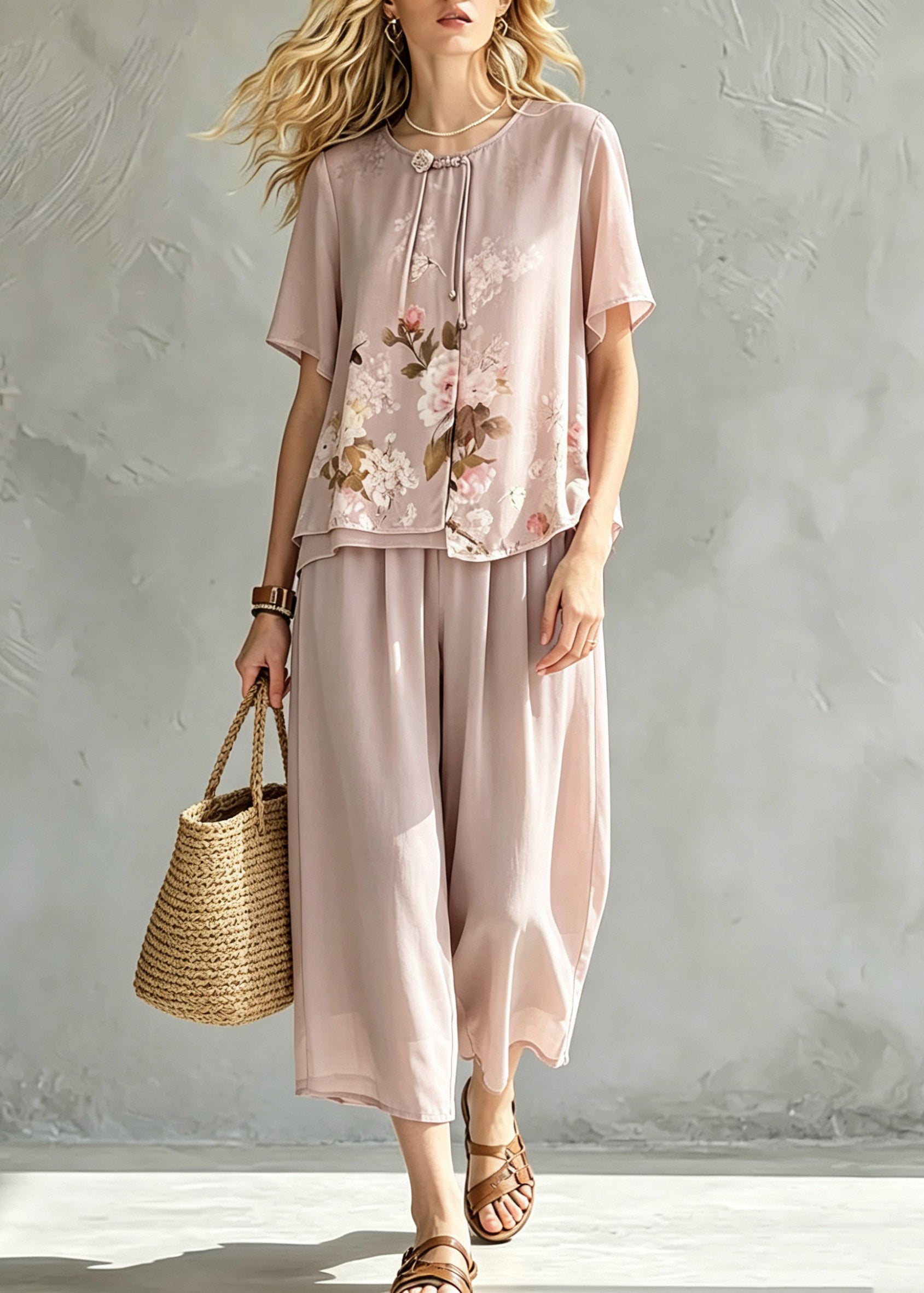Handmade Pink Asymmetrical Print Chiffon T Shirt And Cop Pants Short Sleeve