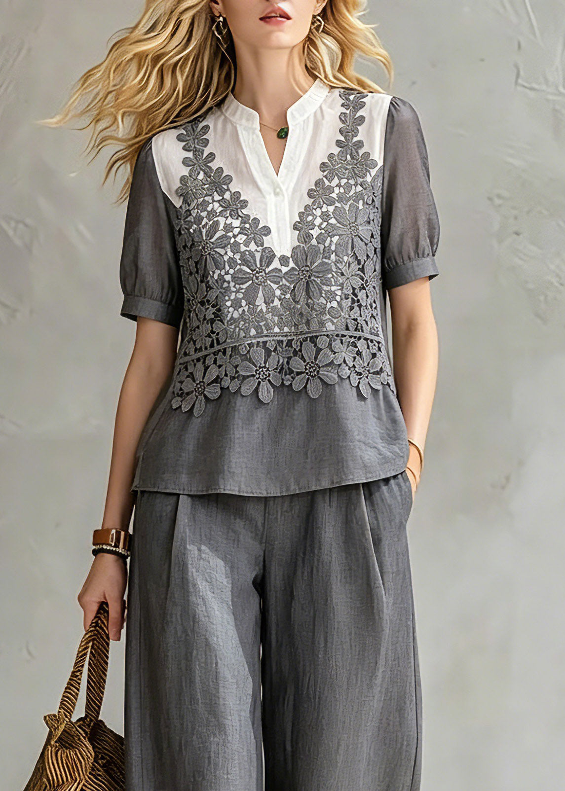 Loose Grey Stand Collar Floral Shirt And Wide Leg Pants Two Pieces Set Summer