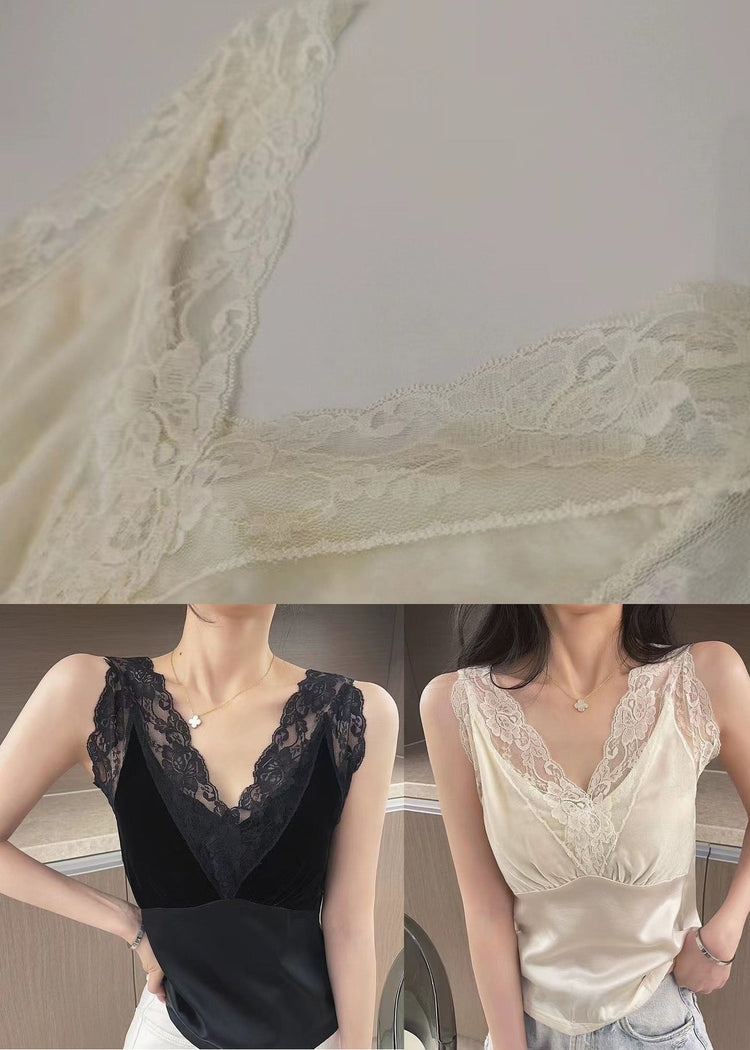 Chic Black Lace Patchwork Silk Tanks Sleeveless