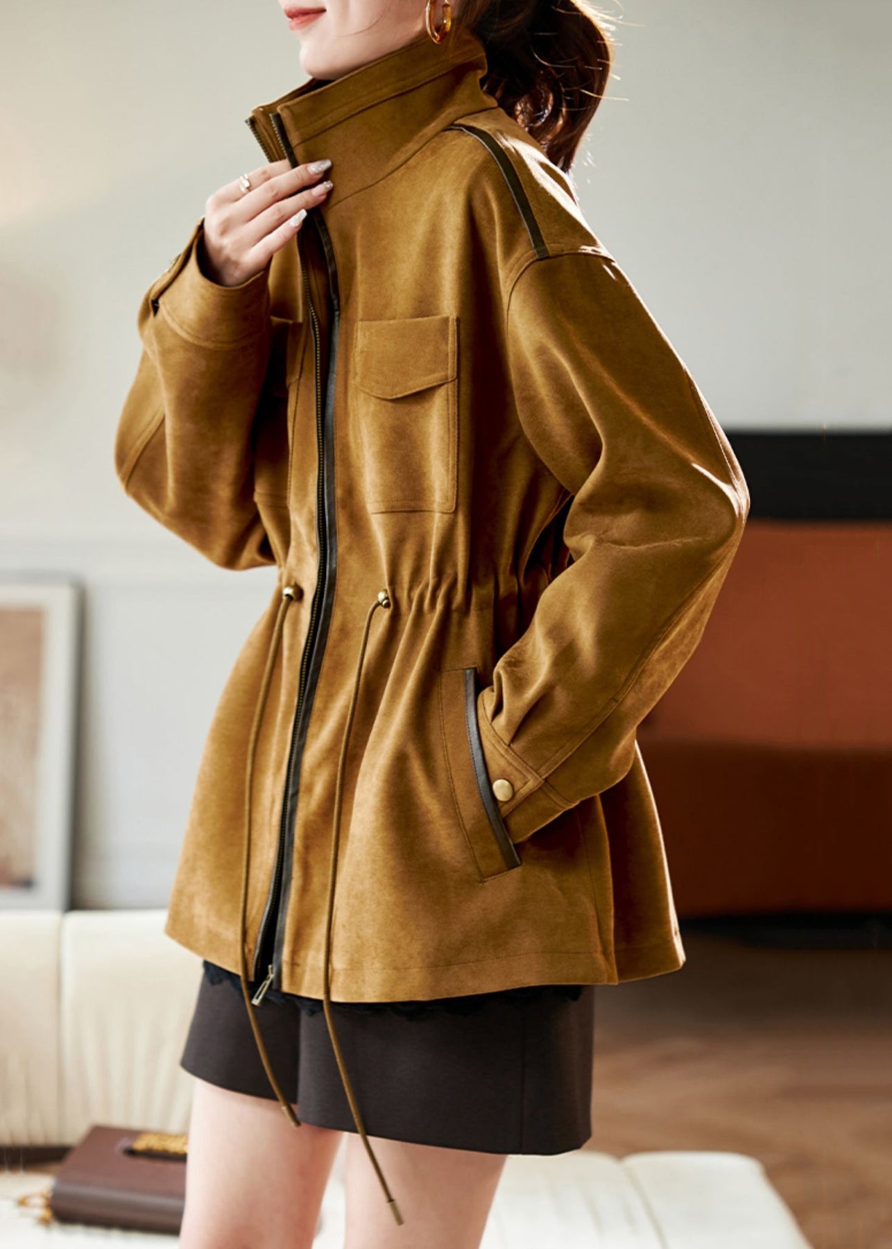 Loose Caramel Stand Collar Drawstring Pockets Cotton Coat Winter