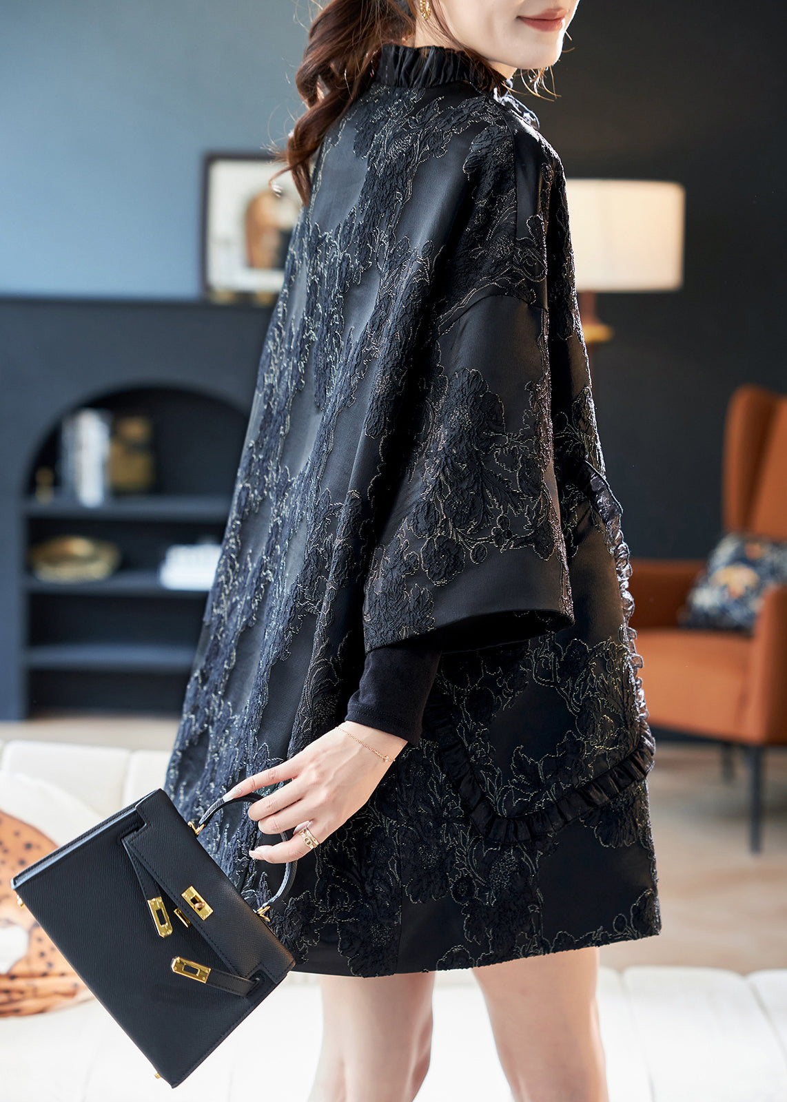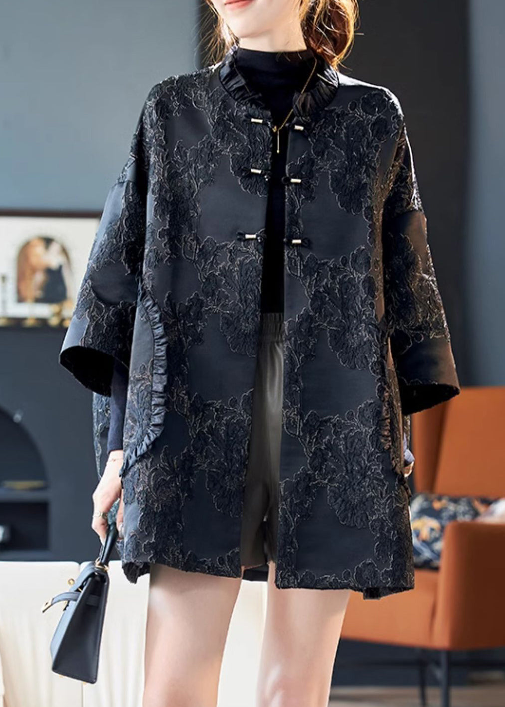 Jacquard Black Ruffled Button Pockets Silk Coats Bracelet Sleeve