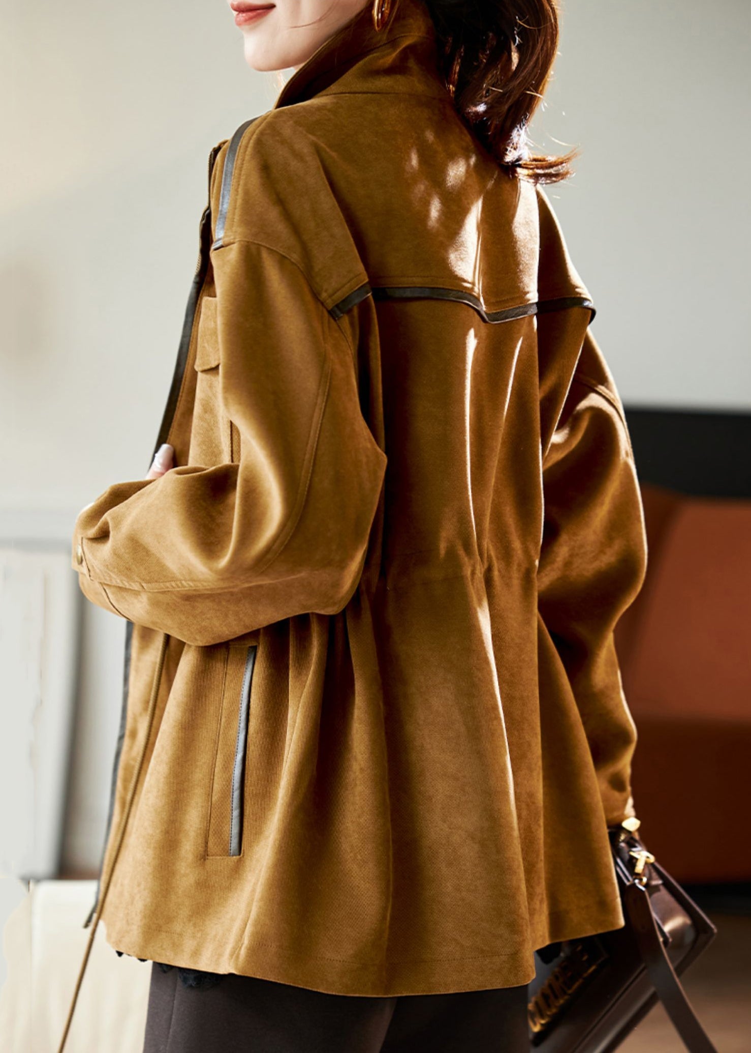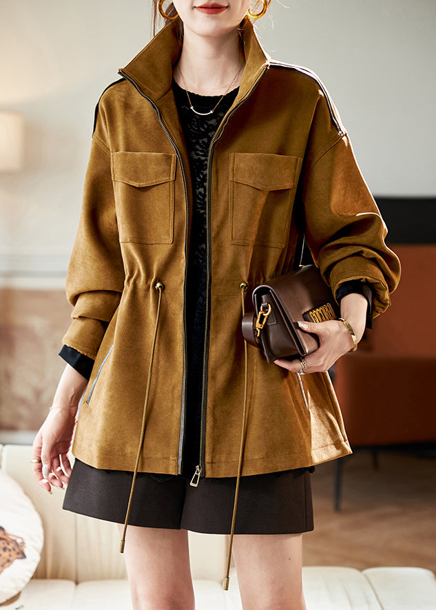 Loose Caramel Stand Collar Drawstring Pockets Cotton Coat Winter