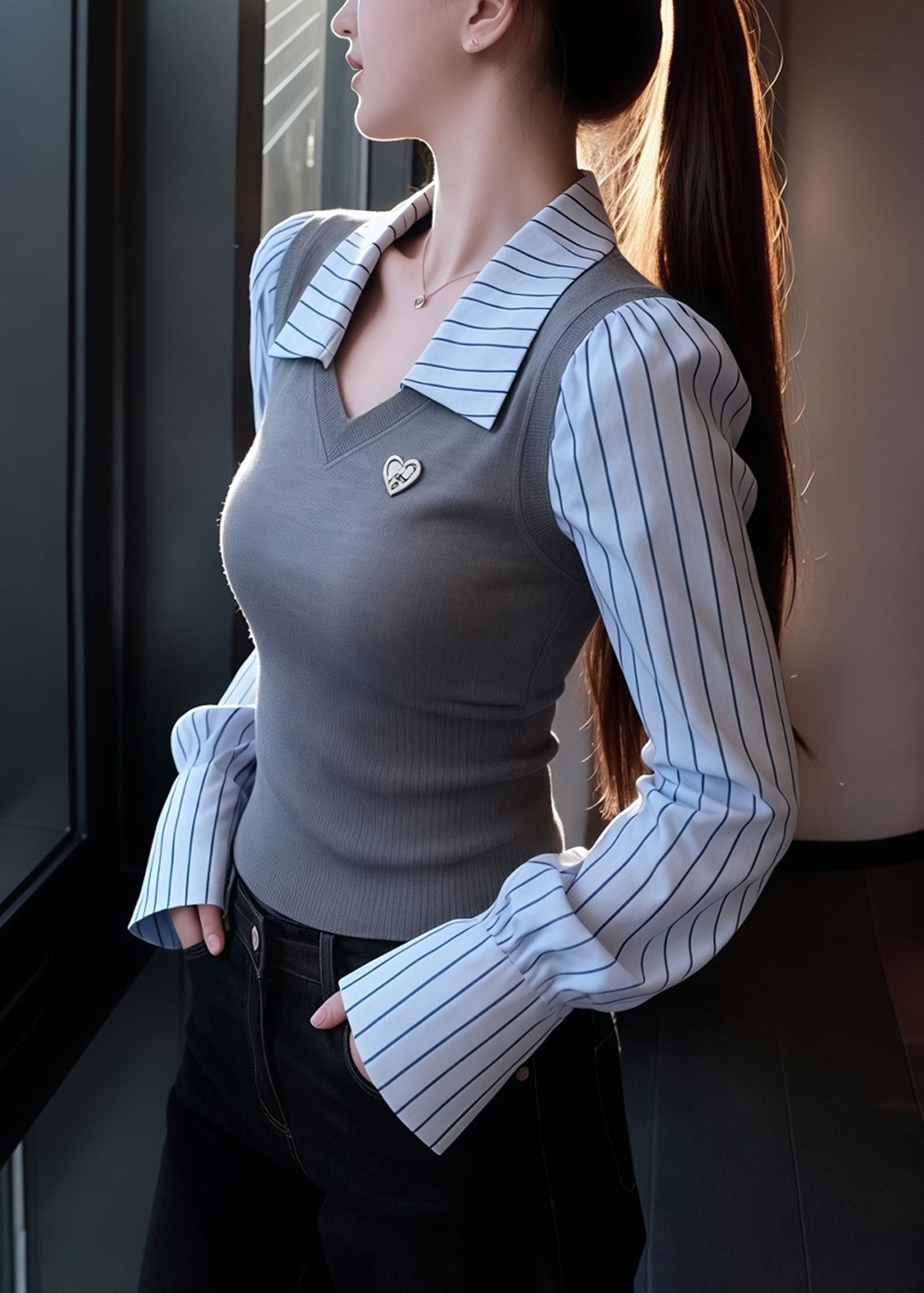 Slim Fit Grey Striped False Two Pieces Patchwork Knit Sweaters Winter