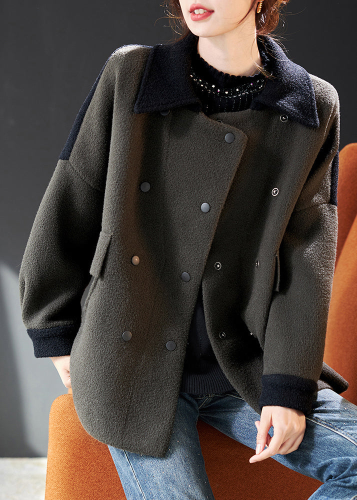 Vintage Army Green Double Breast Pockets Patchwork Woolen Coat Winter
