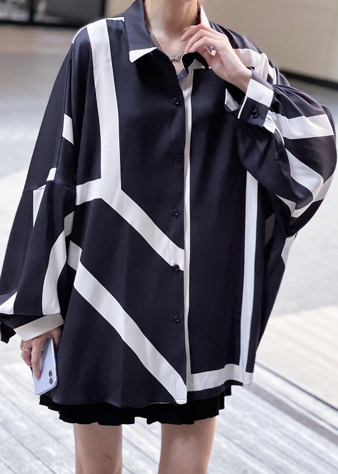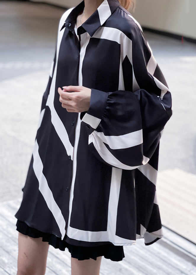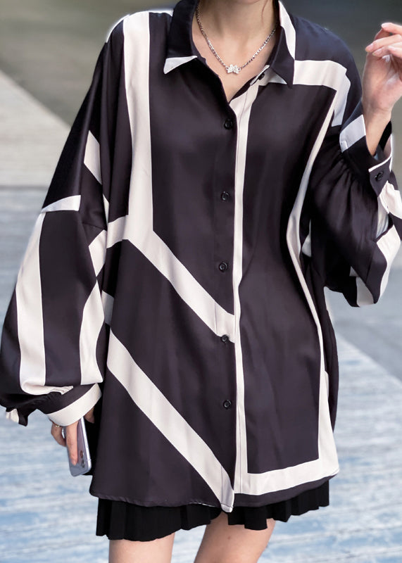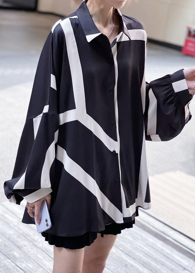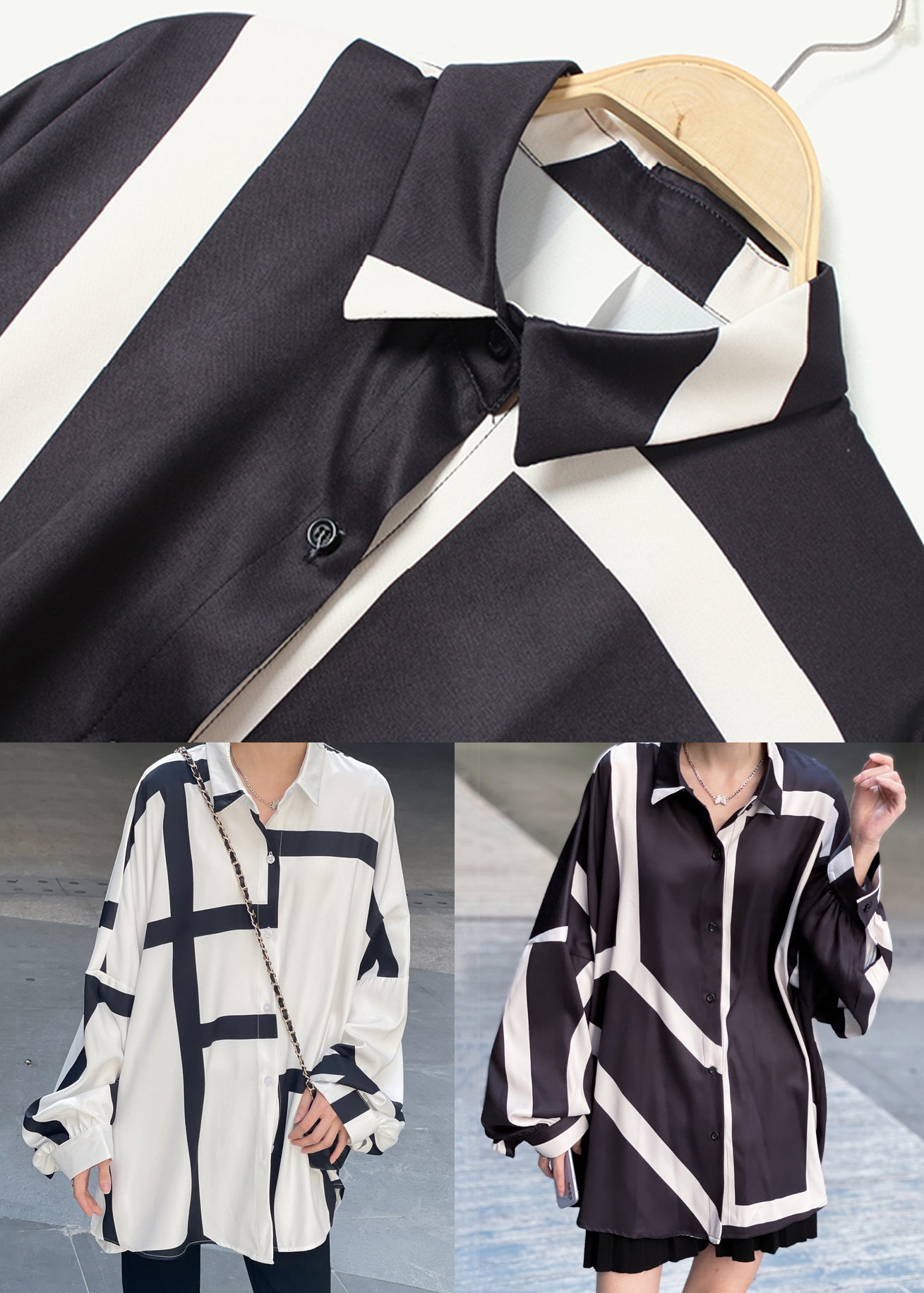 Black Button Patchwork Cotton Shirts Peter Pan Collar Fall