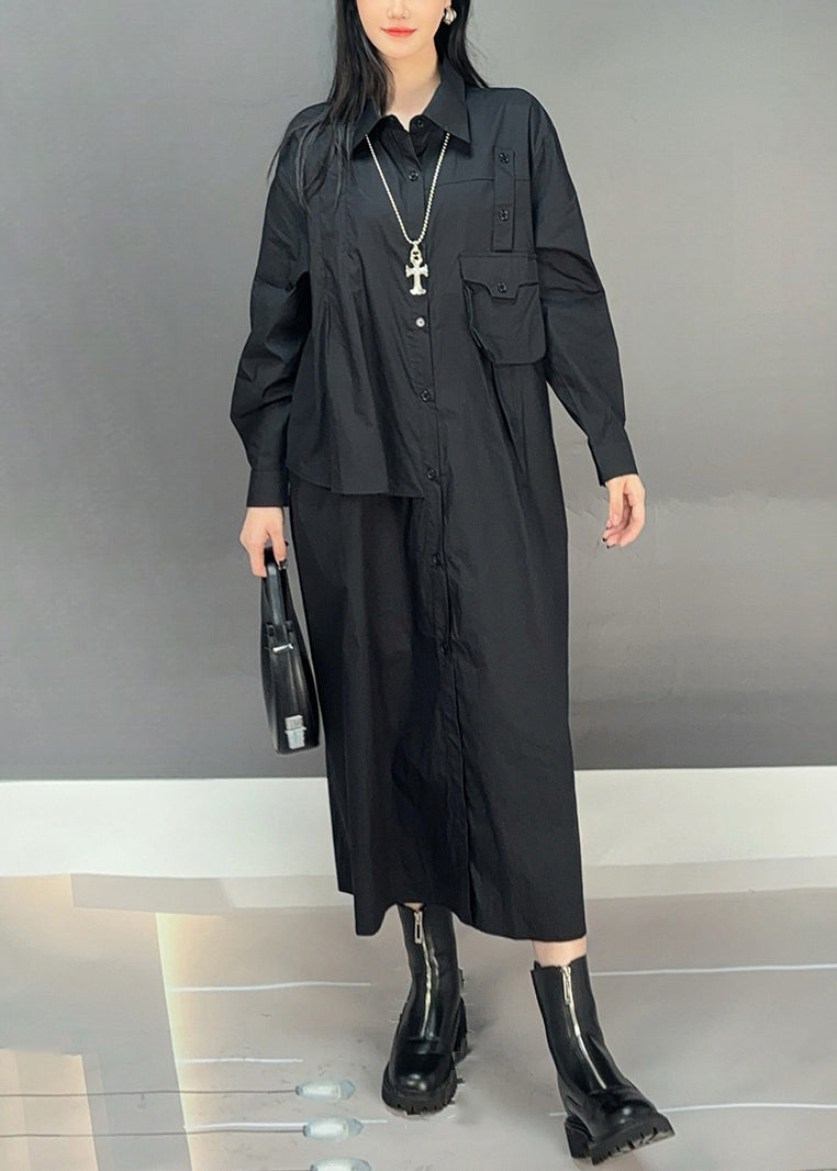 Black Button Solid Cotton Fall Blouses Dresses Asymmetrical