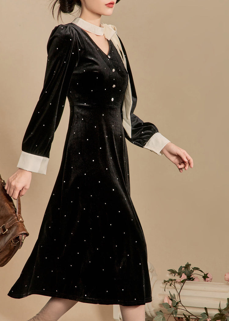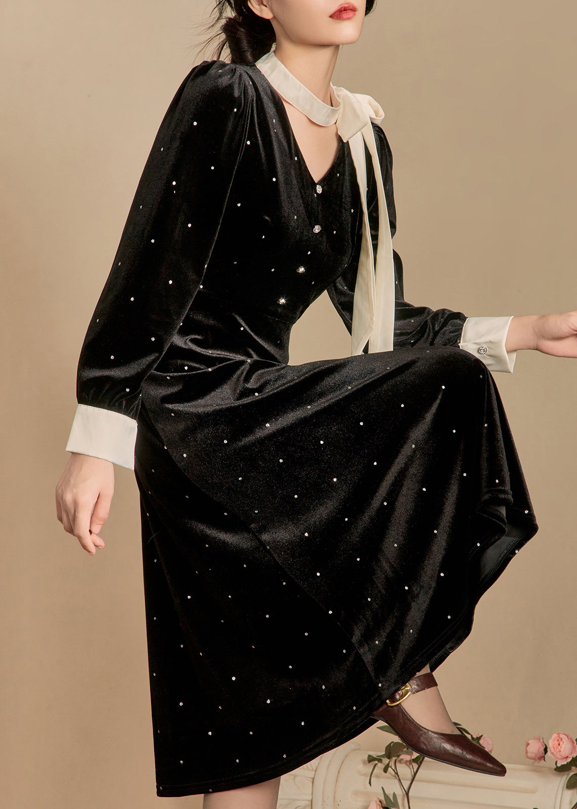 French Black Bow Dot Silk Velvet Long Dress Winter