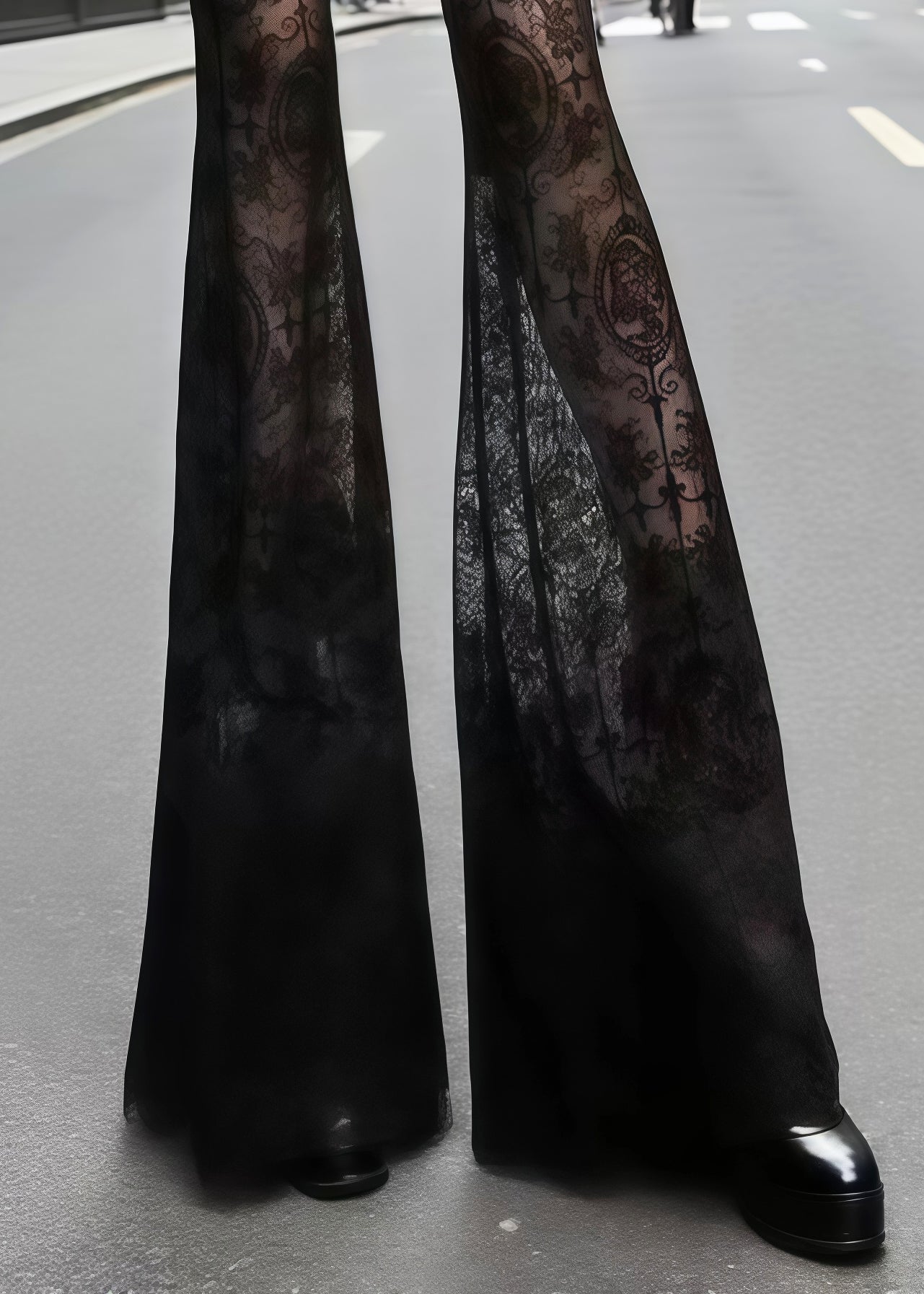 French Black Hollow Out Patchwork Lace Flared Trousers Summer