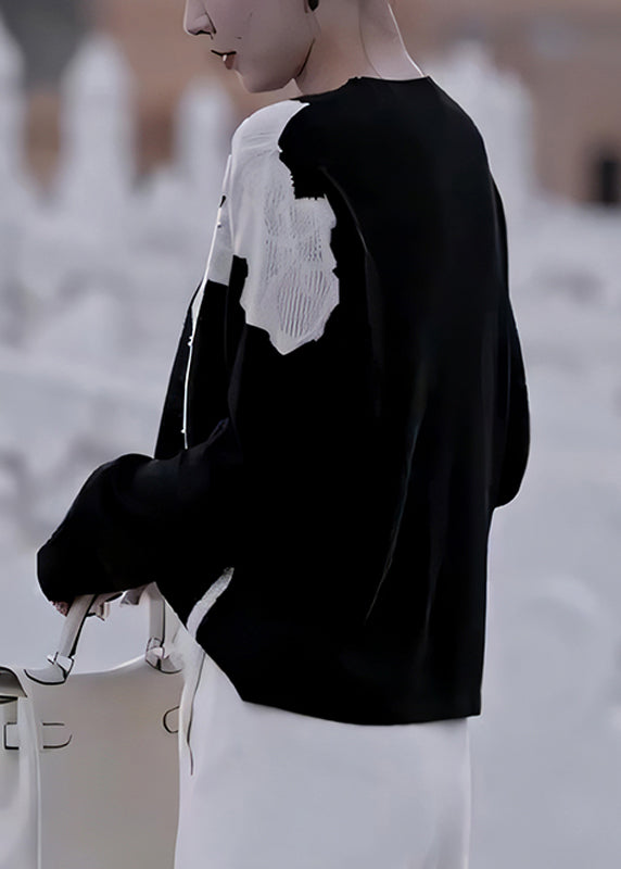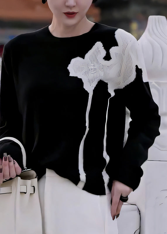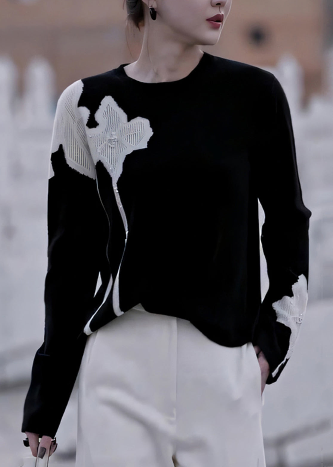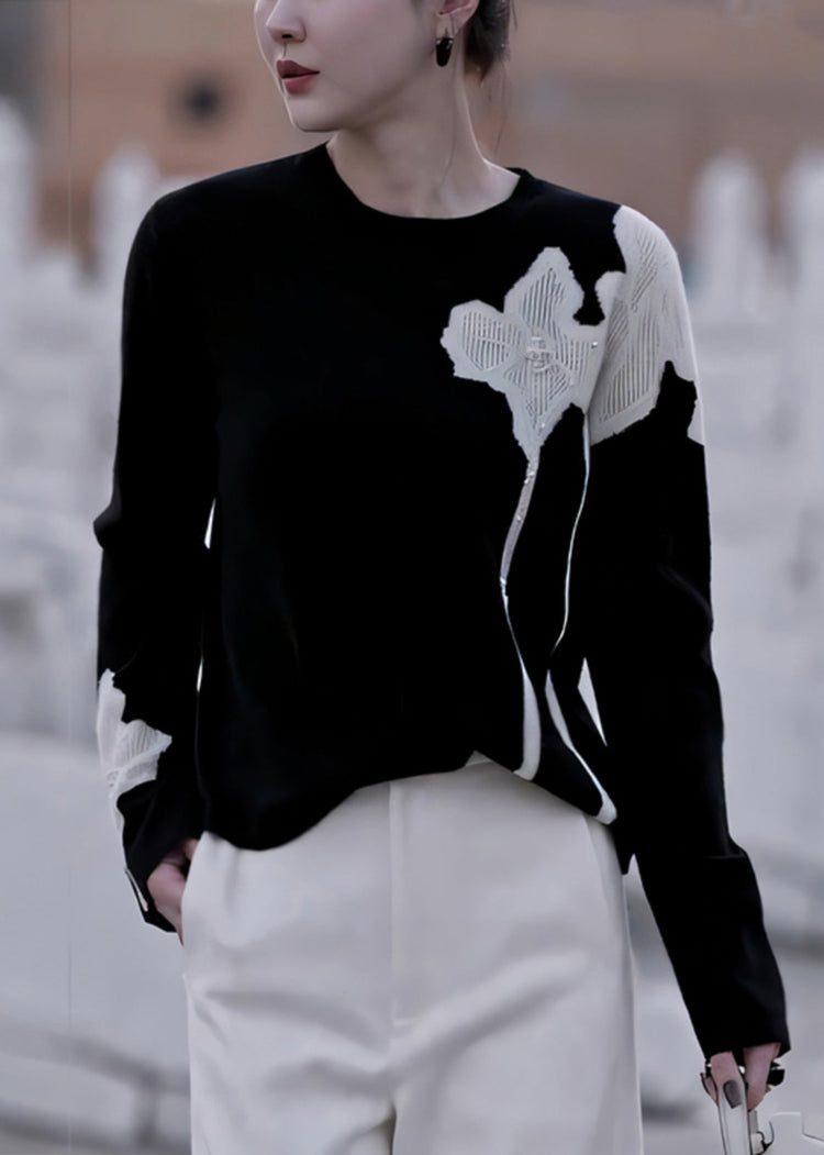 French Black O Neck Print Nail Bead Knit Sweater Fall