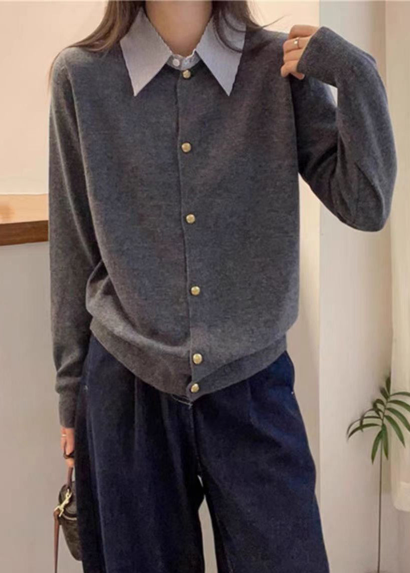 French Black Peter Pan Collar Button Patchwork Knit Top Fall