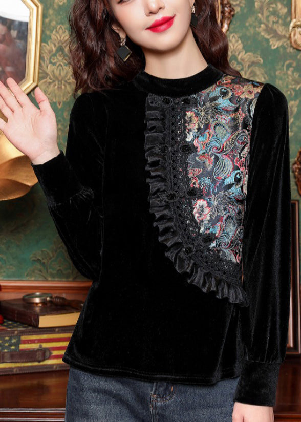 French Black Ruffled Patchwork Print Silk Velour Top Long Sleeve