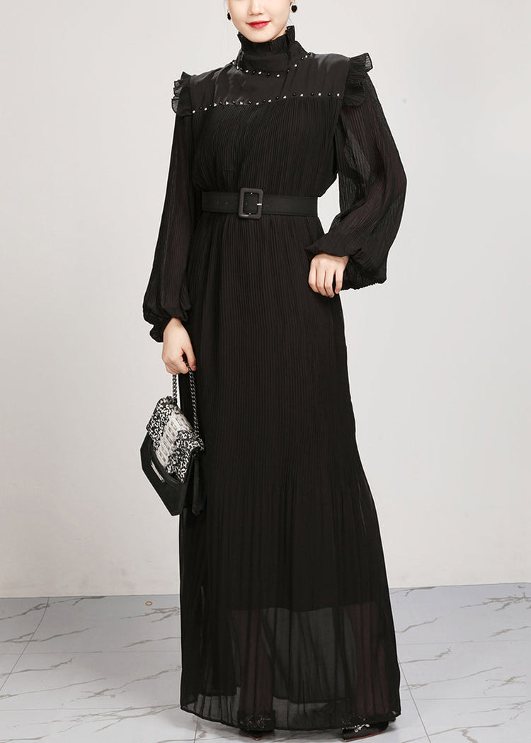 French Black Ruffled Solid Chiffon Maxi Dresses Fall