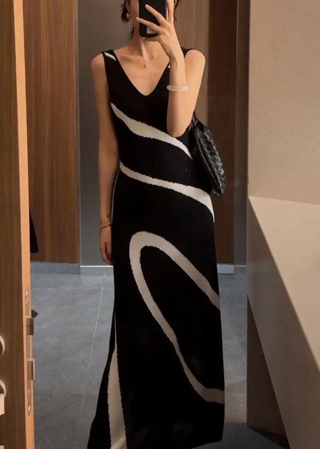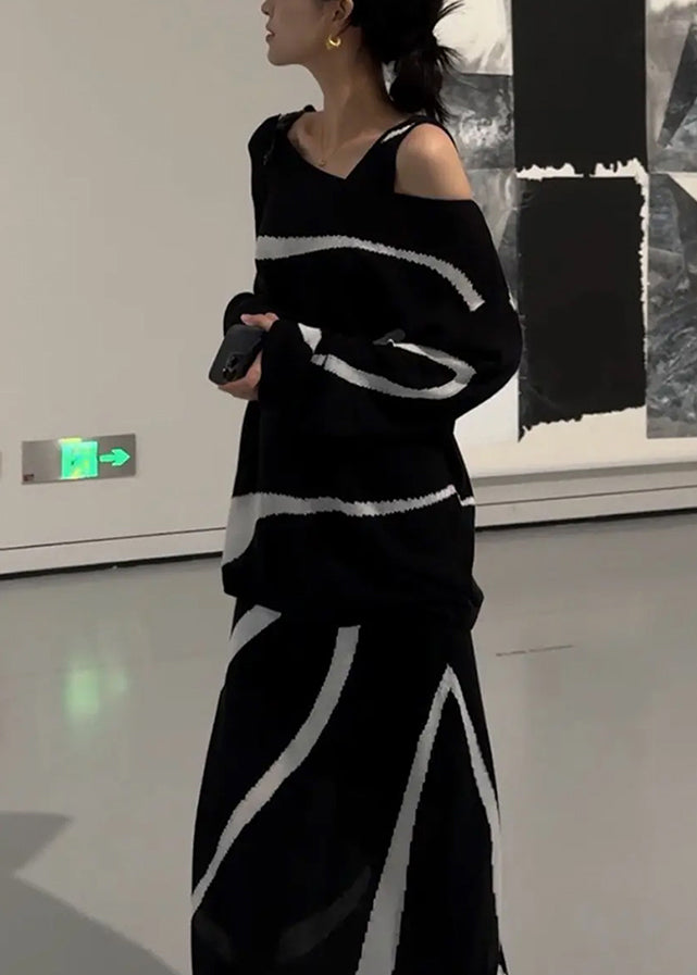 French Black Striped Tops And Dresses Knit Two Piece Set Fall