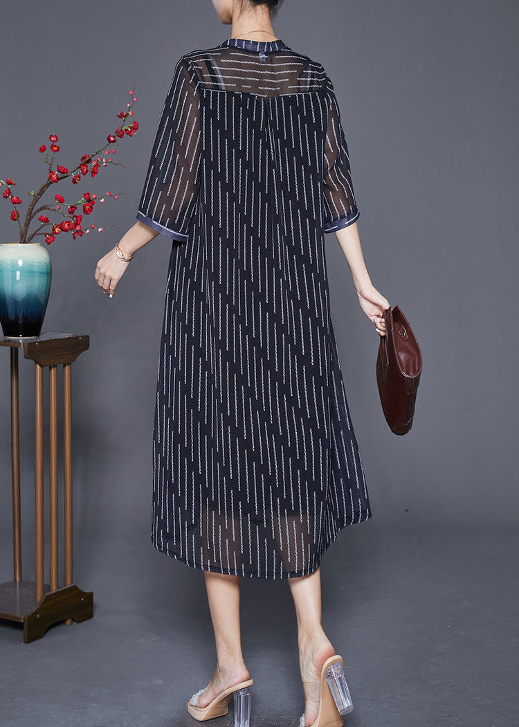French Black Striped Wrinkled Draping Chiffon Dresses Summer