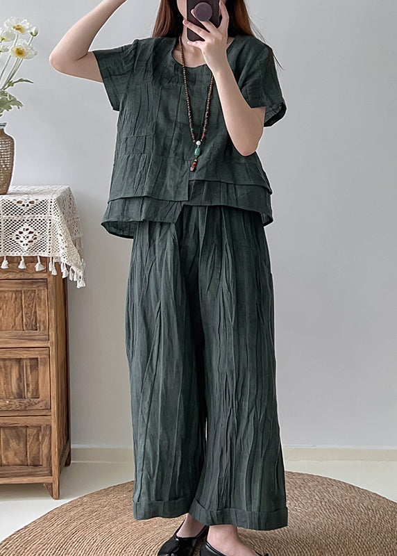 French Blackish Green Asymmetrical Tie Dye Linen Two Pieces Set Summer