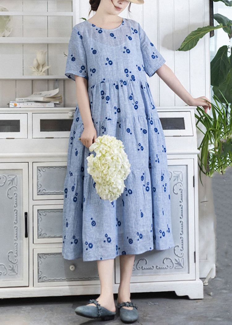 French Blue Embroidered Lace Up Pockets Linen Dress Summer