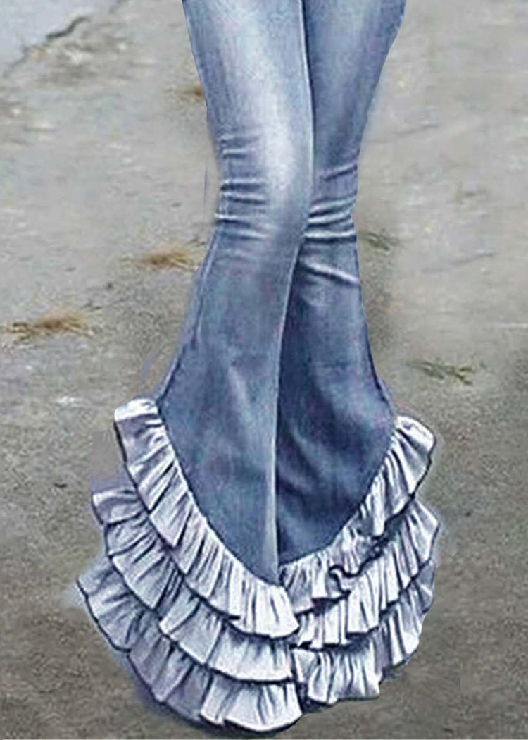 French Blue High Waist Patchwork Ruffles Denim Bell-bottom Trousers Summer