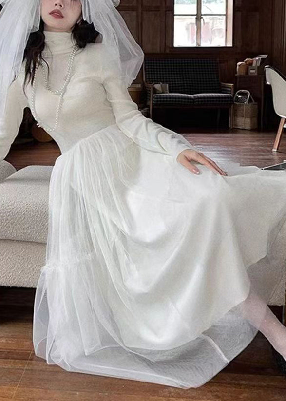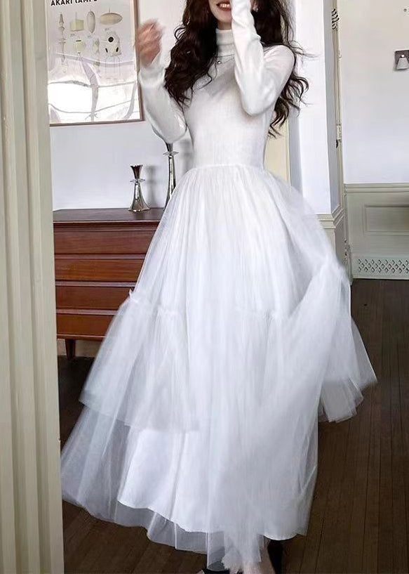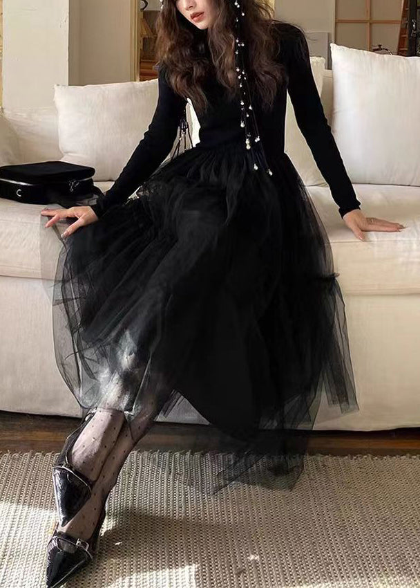 French Blue Ruffled Asymmetrical Tulle Patchwork Knit Dresses Spring