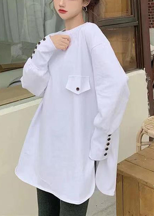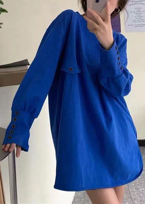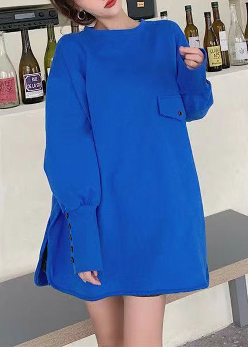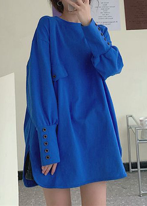 Plus Size Blue O Neck Side Open Cotton Tops Fall