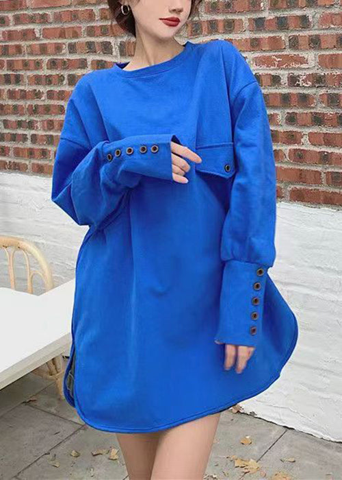 Plus Size Blue Hooded Patchwork Side Open Cotton Sweatshirt Dress Fall