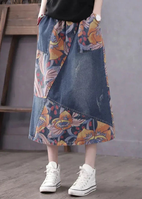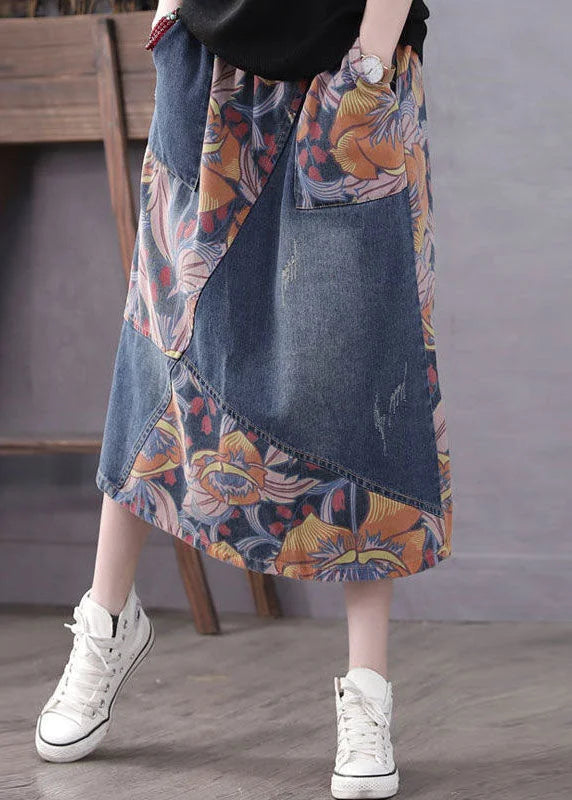 Casual Blue Pockets Patchwork Print A Line Fall Denim Skirt