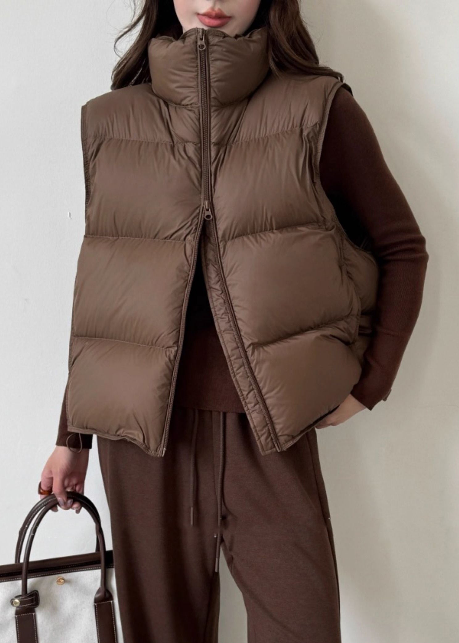 Vintage Coffee Stand Collar Zip Up Duck Down Waistcoat Sleeveless