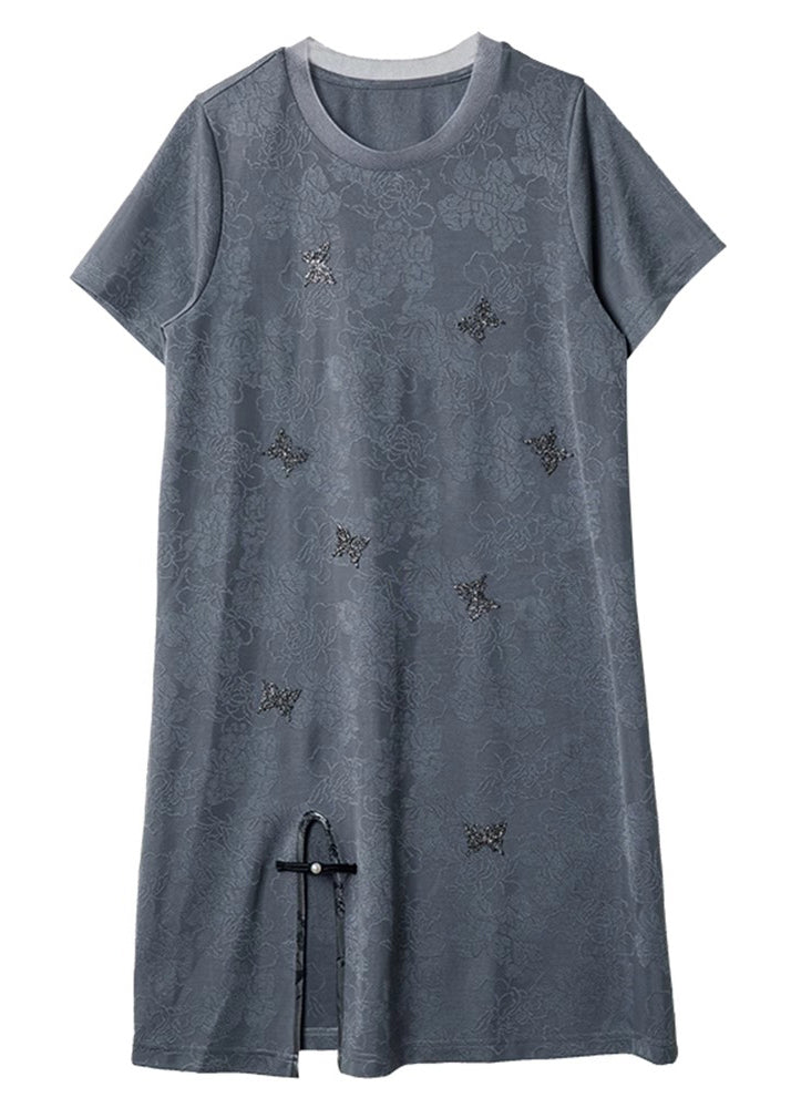 Beautiful Grey O Neck Zircon Jacquard Side Open Silk Dresses Summer