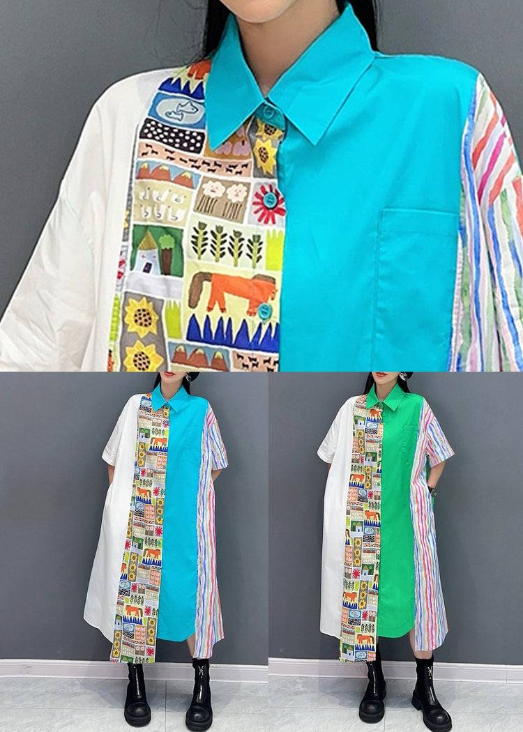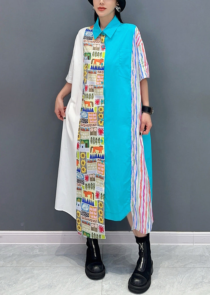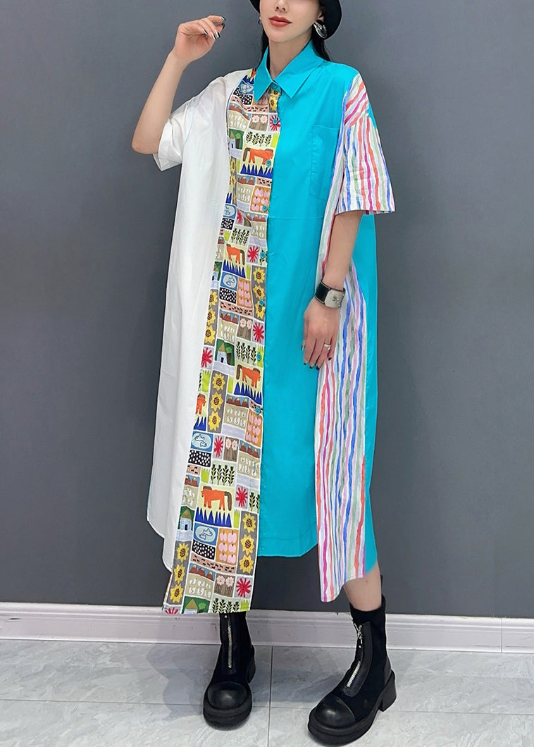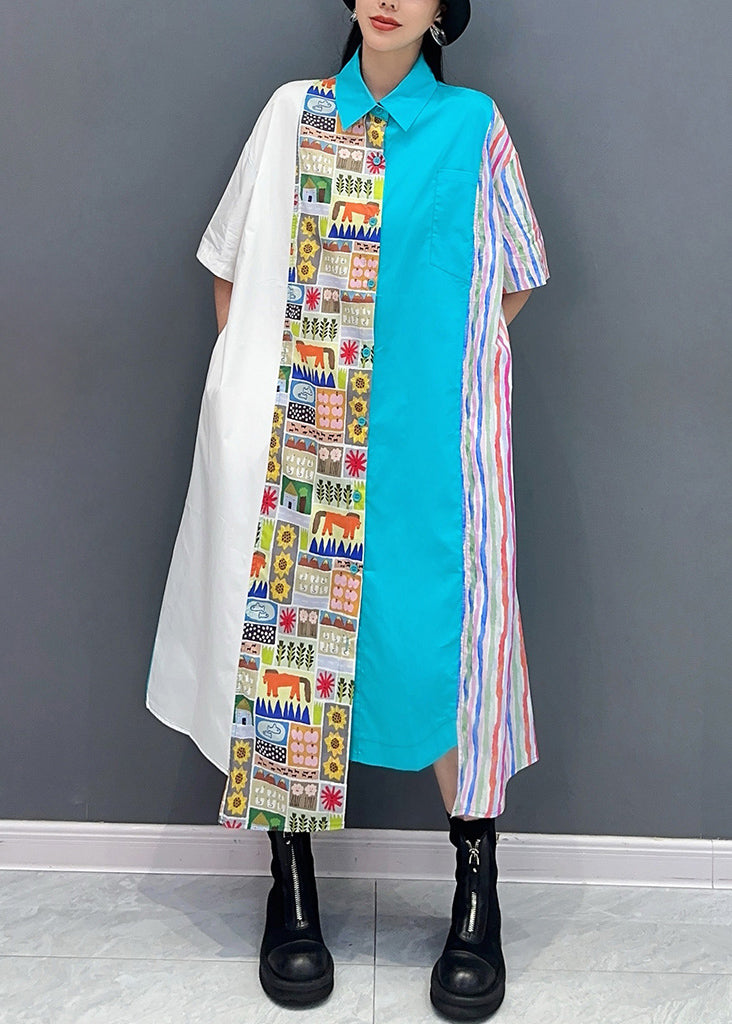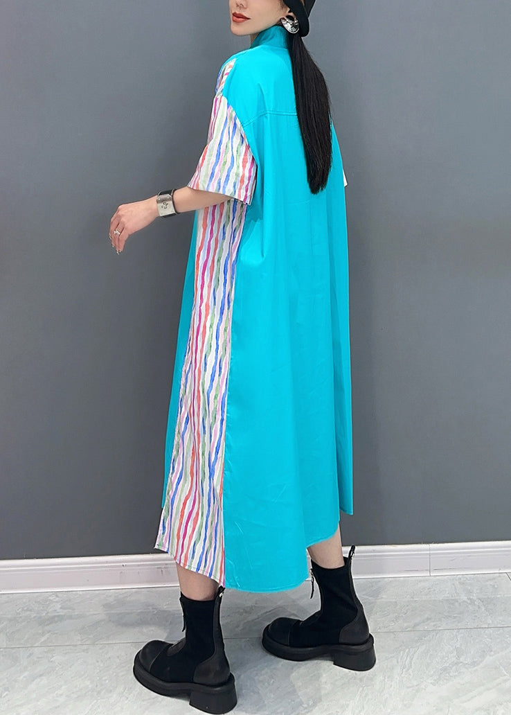 Blue Button Patchwork Cotton Blouses Dresses Peter Pan Collar Summer