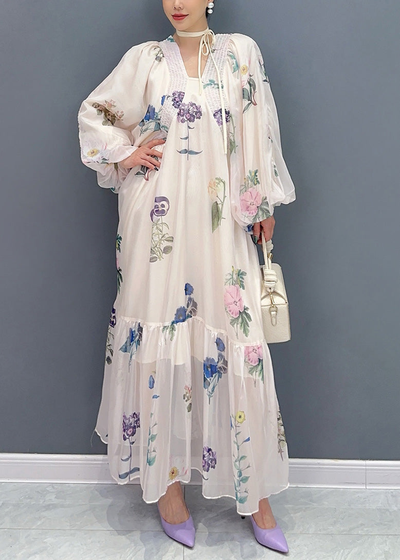 Bohemian White Print Chiffon Long Dresses Lantern Sleeve