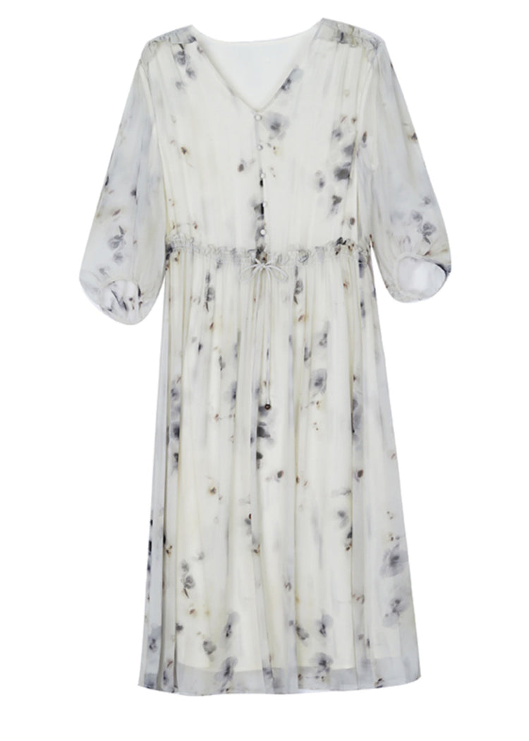 Classy Print V Neck Ruffled Drawstring Silk Dresses Summer
