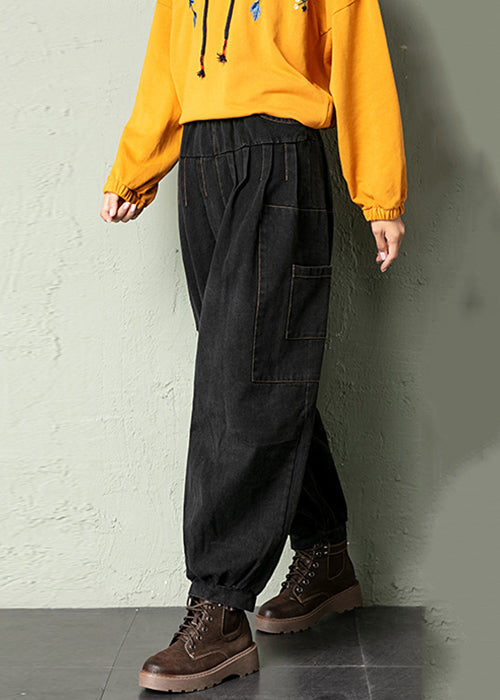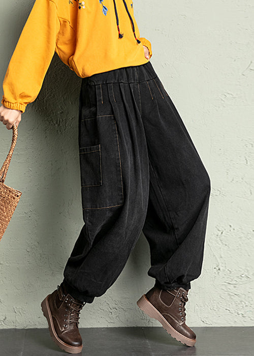 Black Wrinkled Loose Denim Lantern Pants High Waist Spring