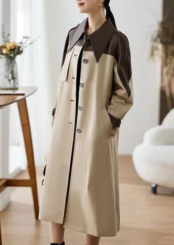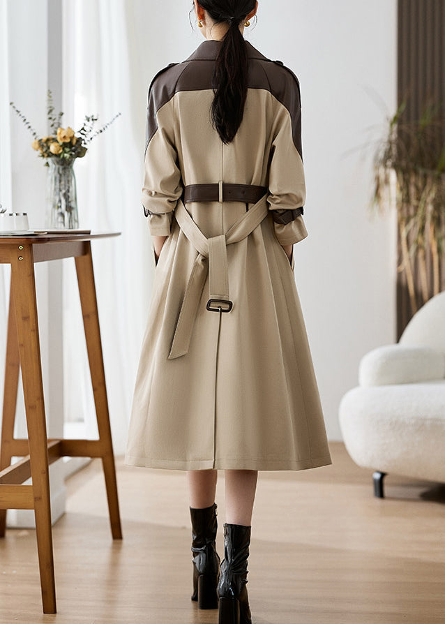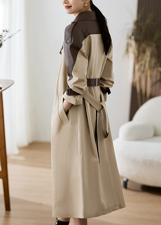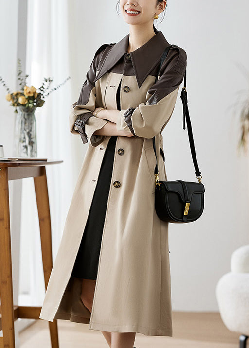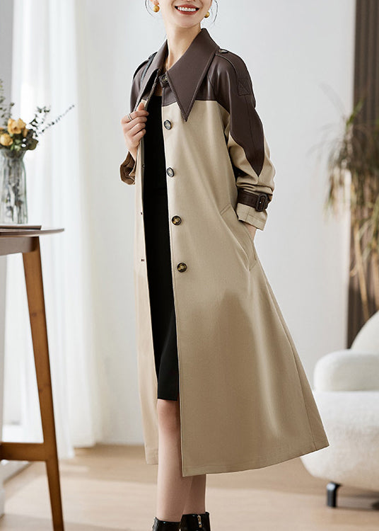 Elegant Khaki Peter Pan Collar Pockets Patchwork Faux Leather Trench Fall