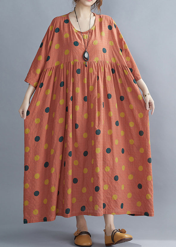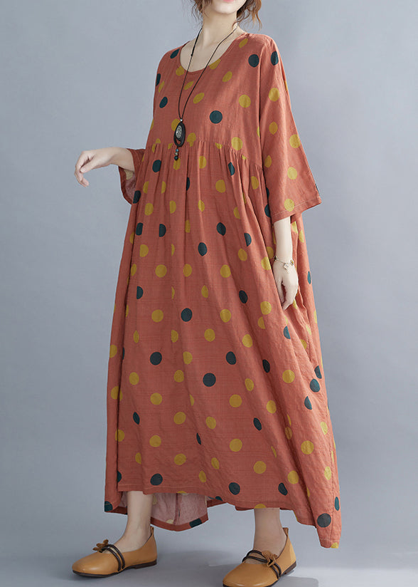 Handmade Red Dot Print Wrinkled Long Dresses Long Sleeve