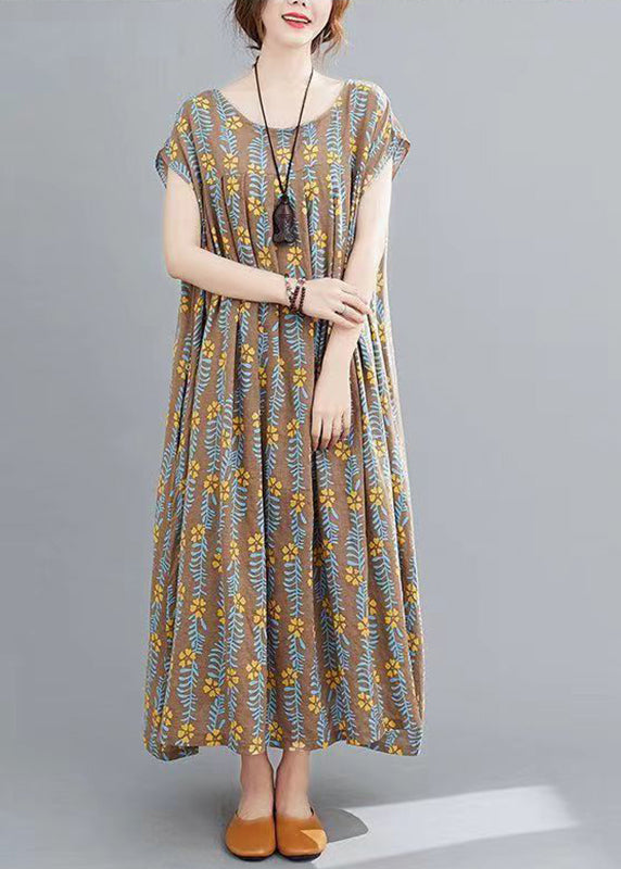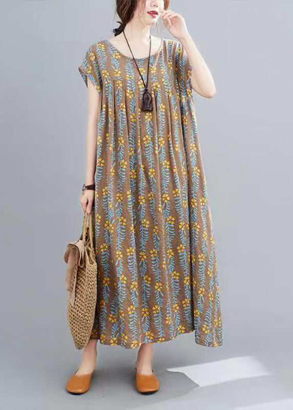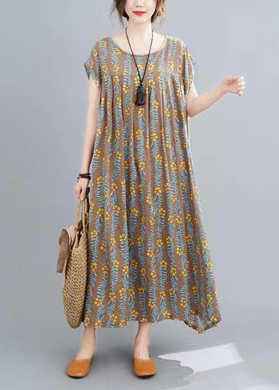 Cute Rose O-Neck Print Wrinkled Maxi Dresses Short Sleeve