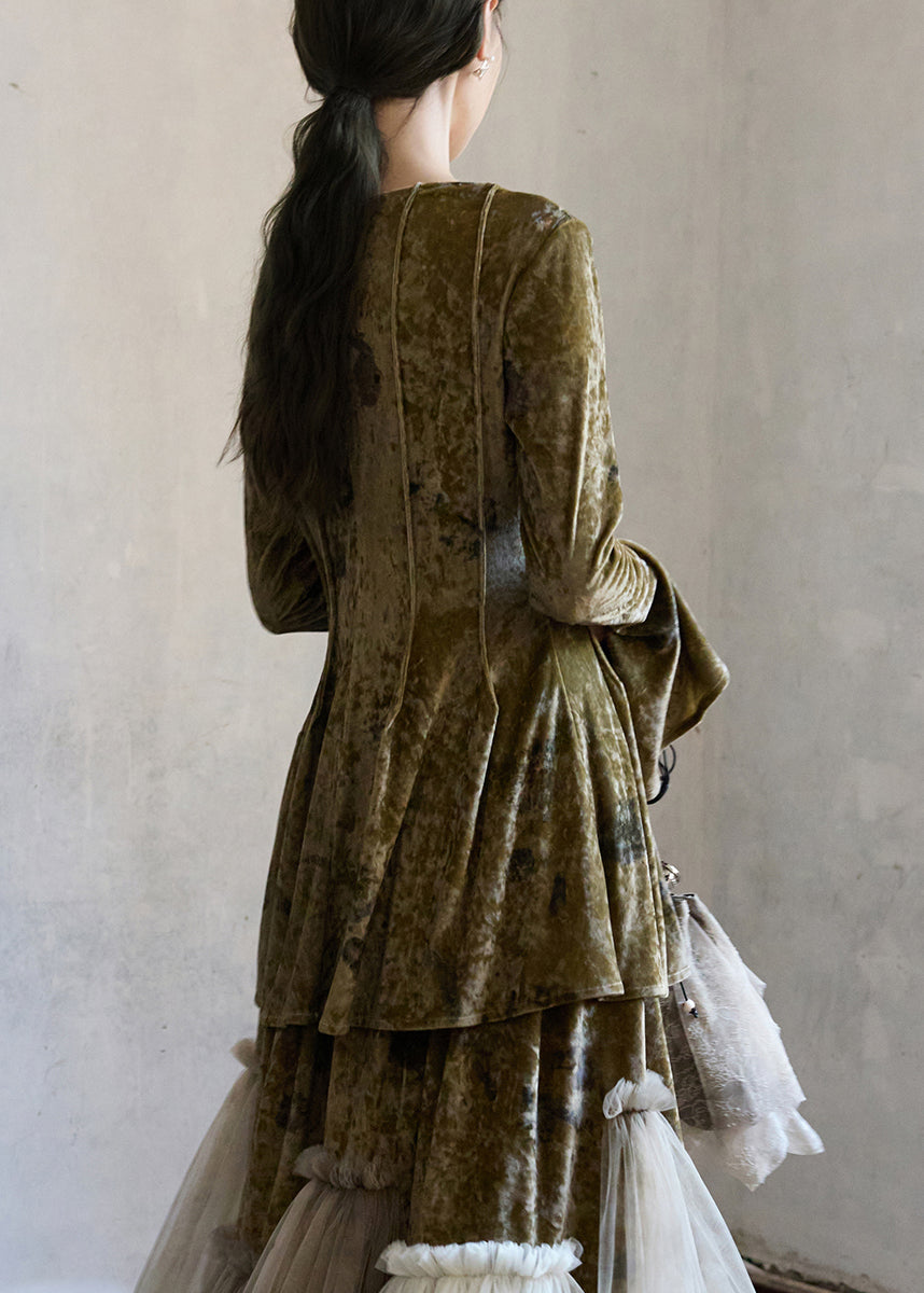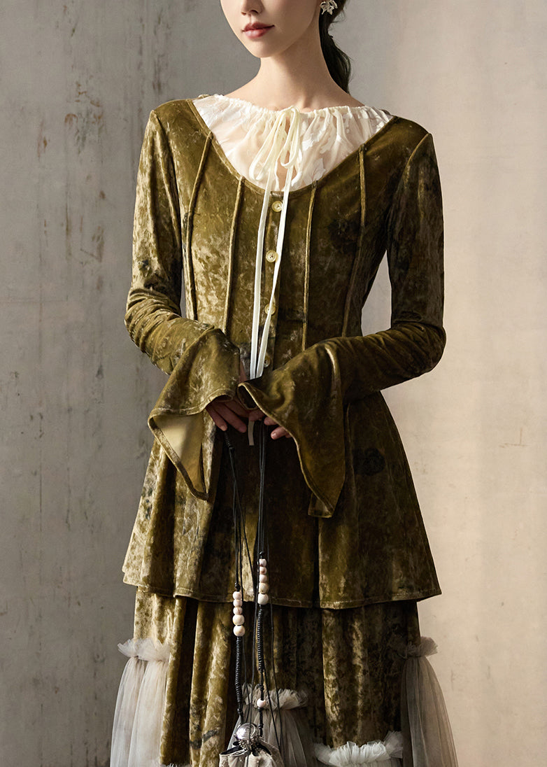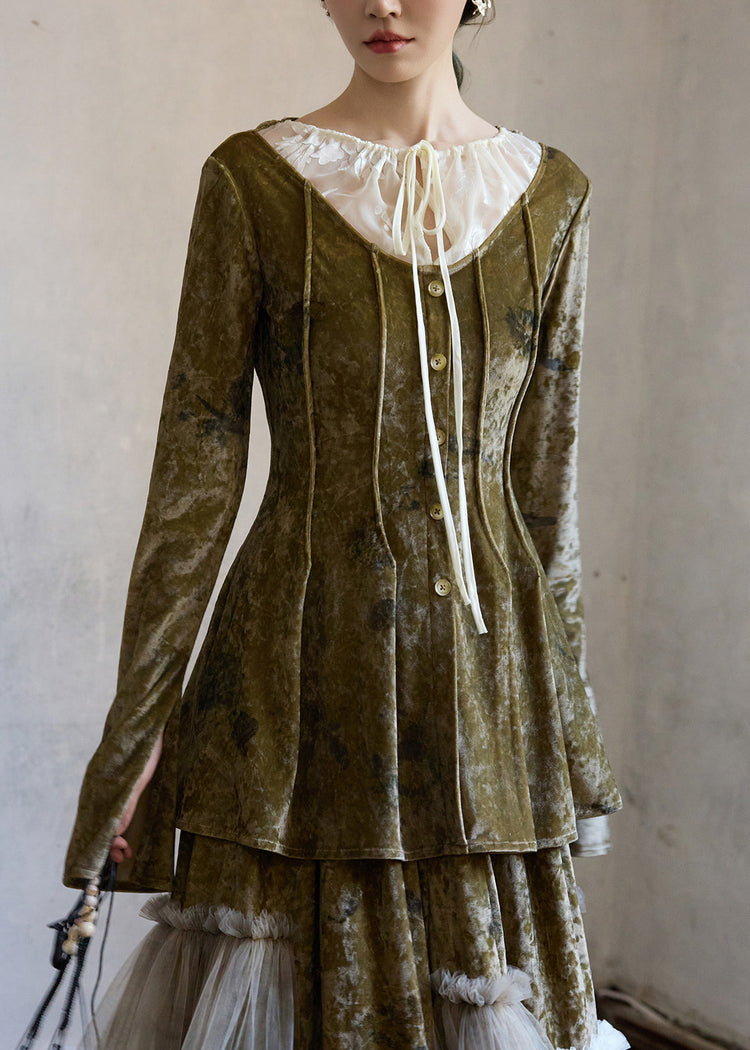Art Green Lace Up Button Patchwork Silk Velour Top Winter