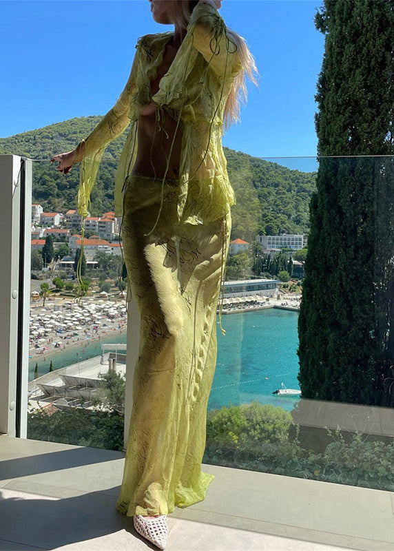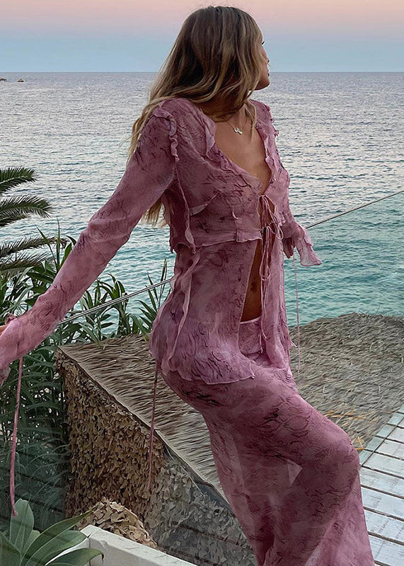 Beautiful Pink Ruffled Lace Up Chiffon Two Pieces Set Flare Sleeve