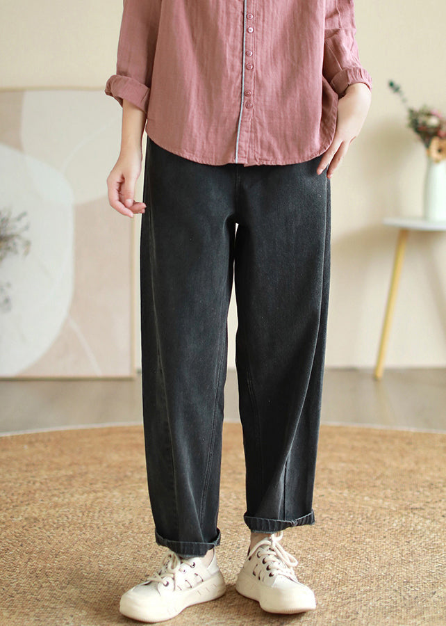 Black Lace Up Denim Crop Pants Elastic Waist Spring