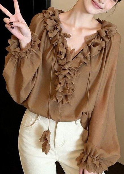 French Khaki Ruffled Lace Up Chiffon Shirts Spring
