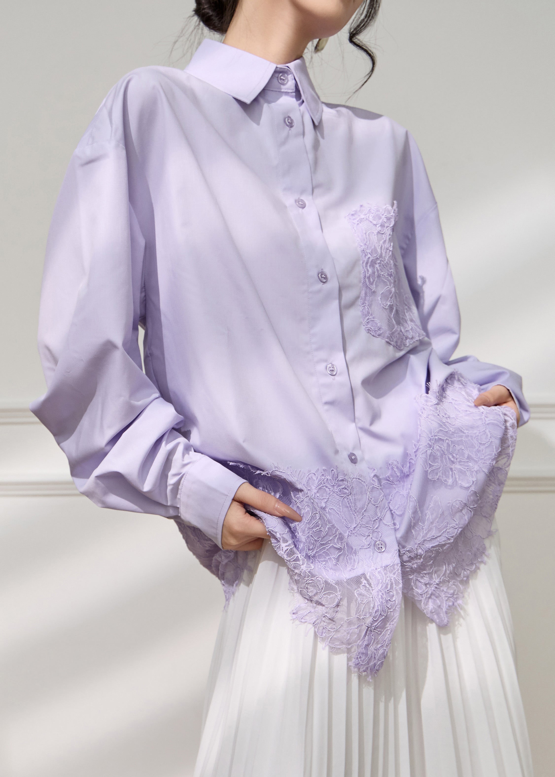 Loose Purple Peter Pan Collar Button Lace Cotton Shirt Fall