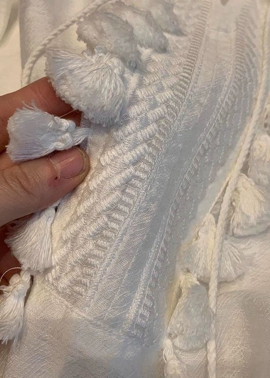 New White Tasseled Lace Up Cotton Shirt Tops Fall
