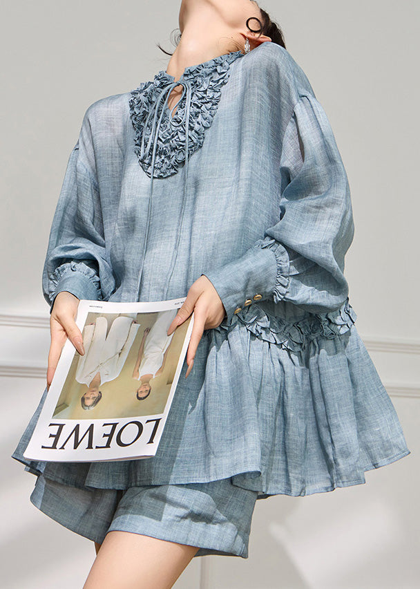 Plus Size Blue Ruffled Lace Up Cotton Two Piece Set Summer