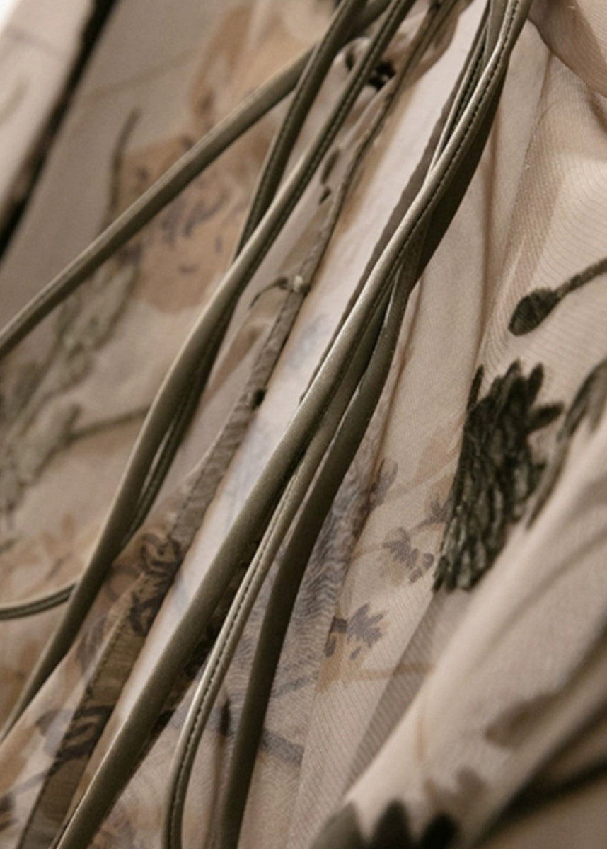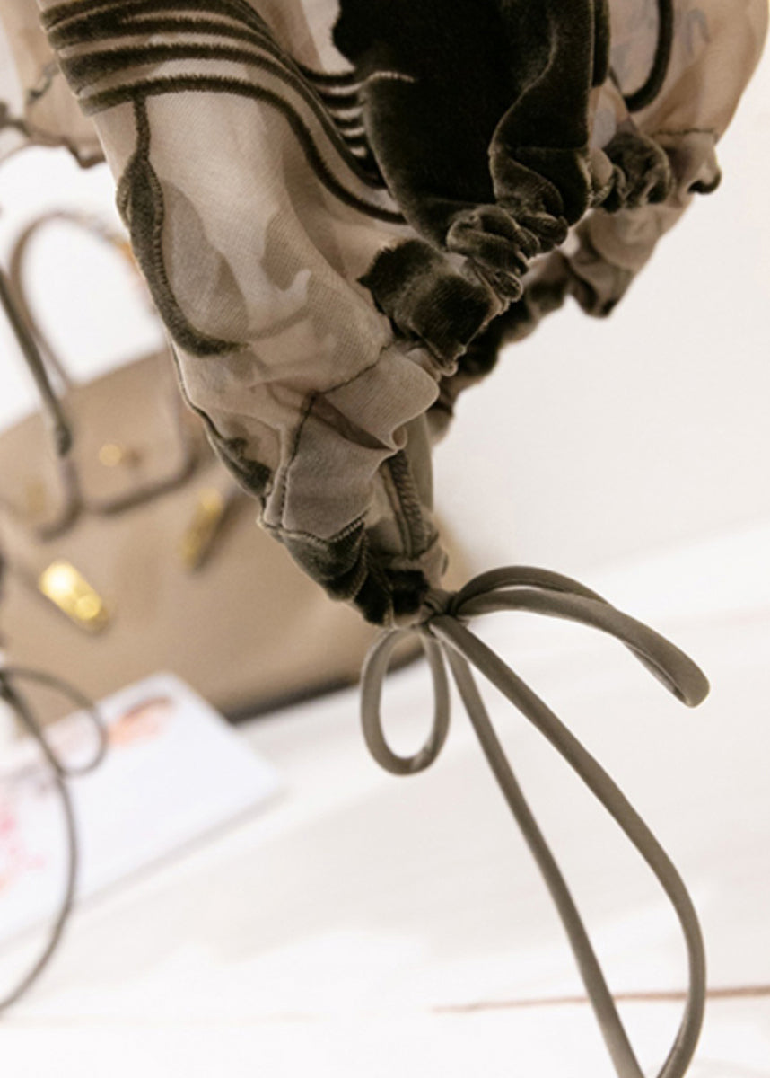 Art Grey V Neck Floral Tie Lace Tulle Top Lantern Sleeve