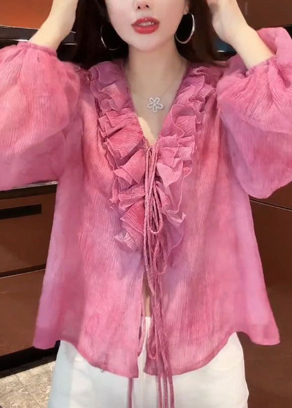 Organic Pink O-Neck Tie Lace Chiffon Shirts Flare Sleeve