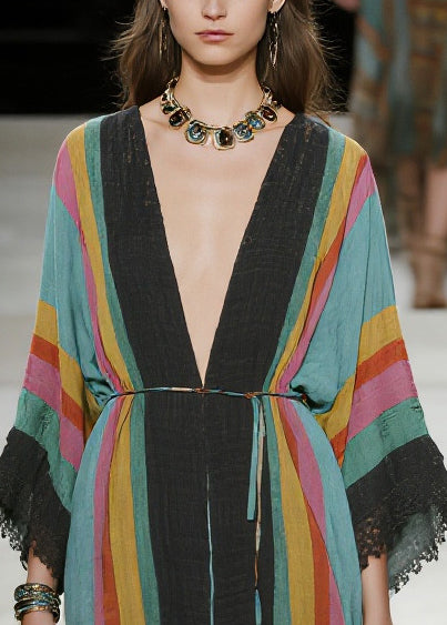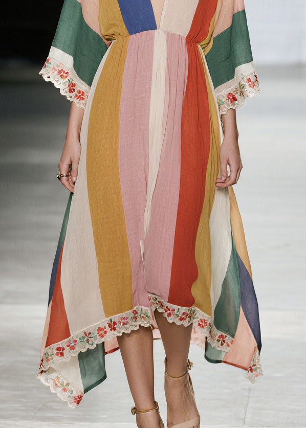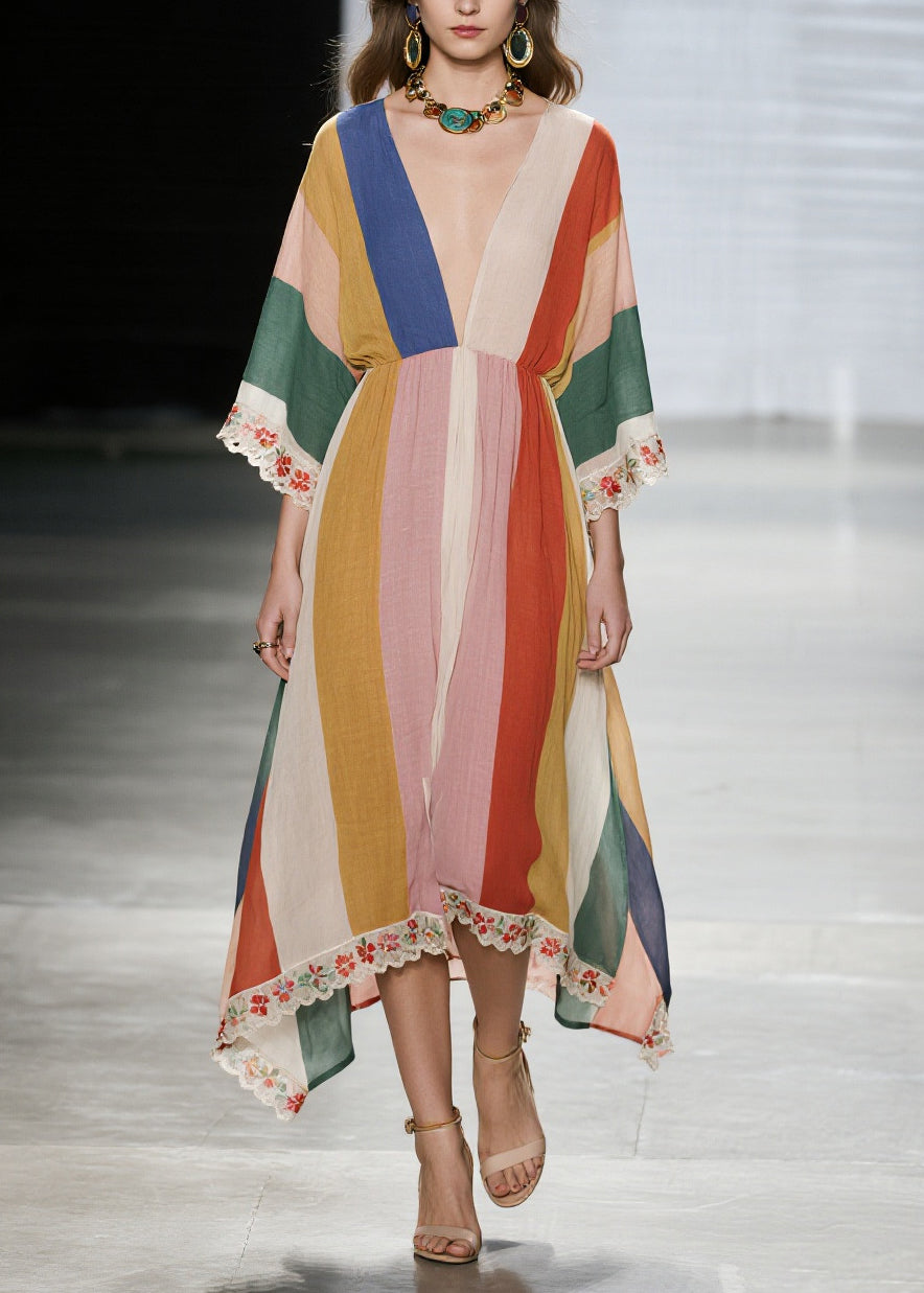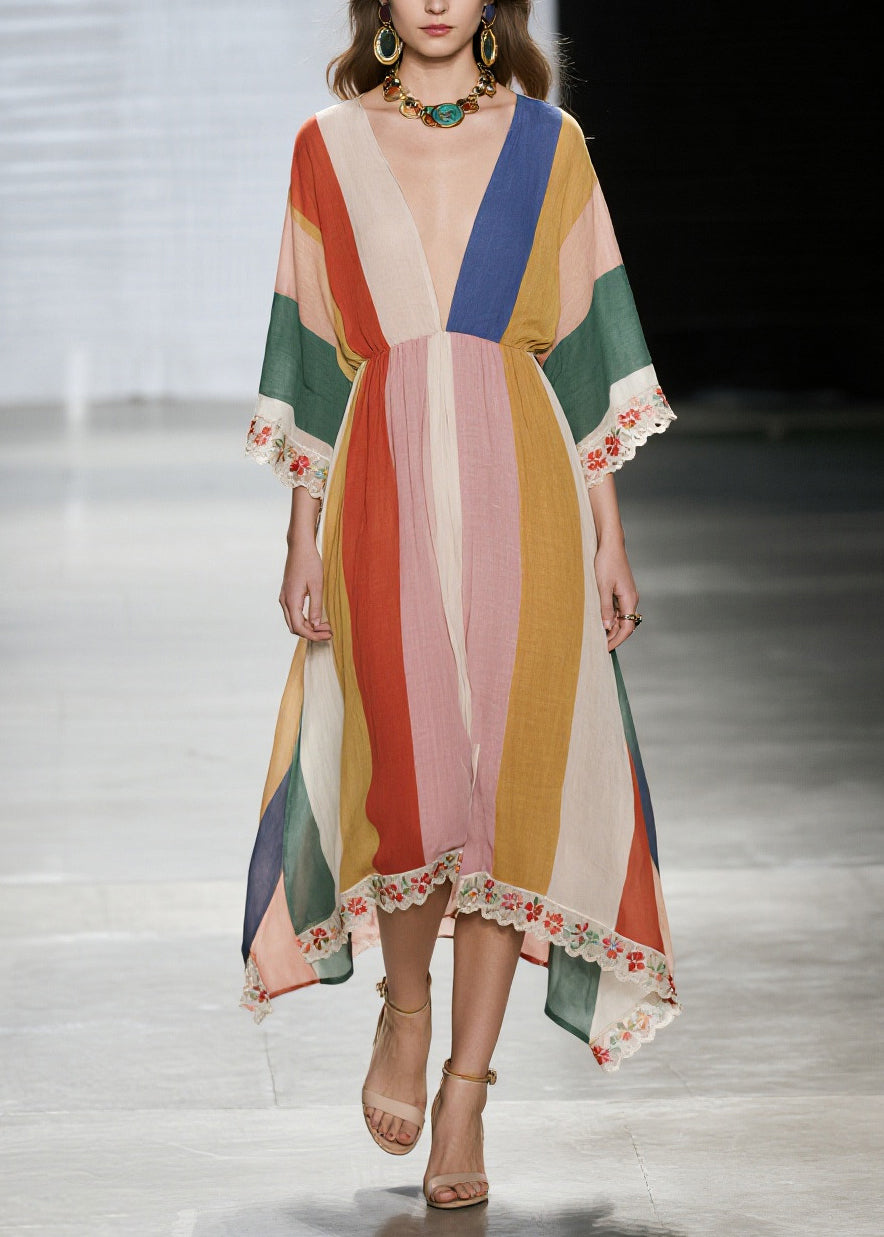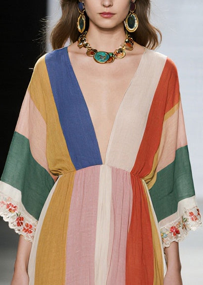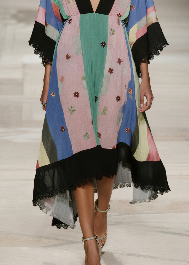 Unique Multicolored V Neck Lace Patchwork Cotton Dresses Summer