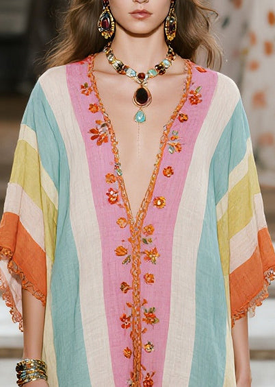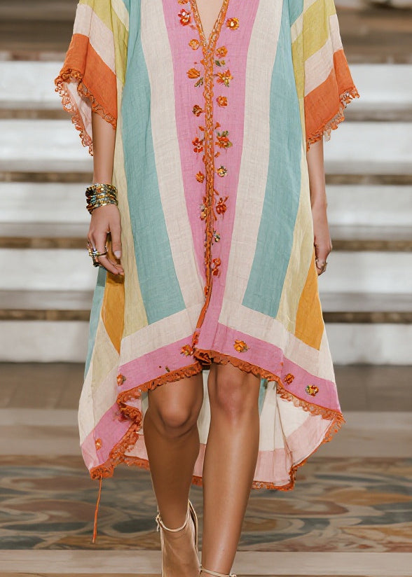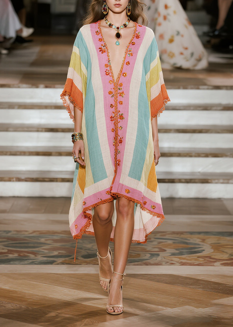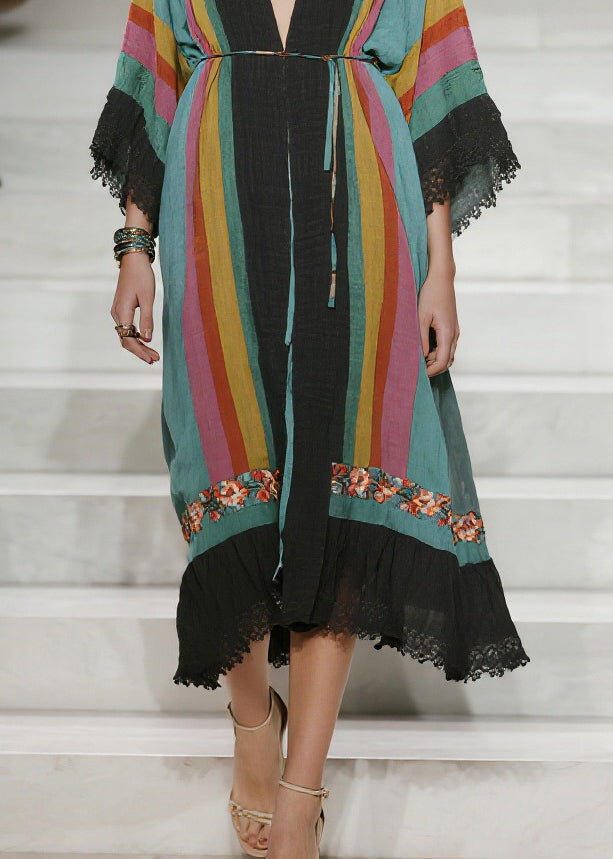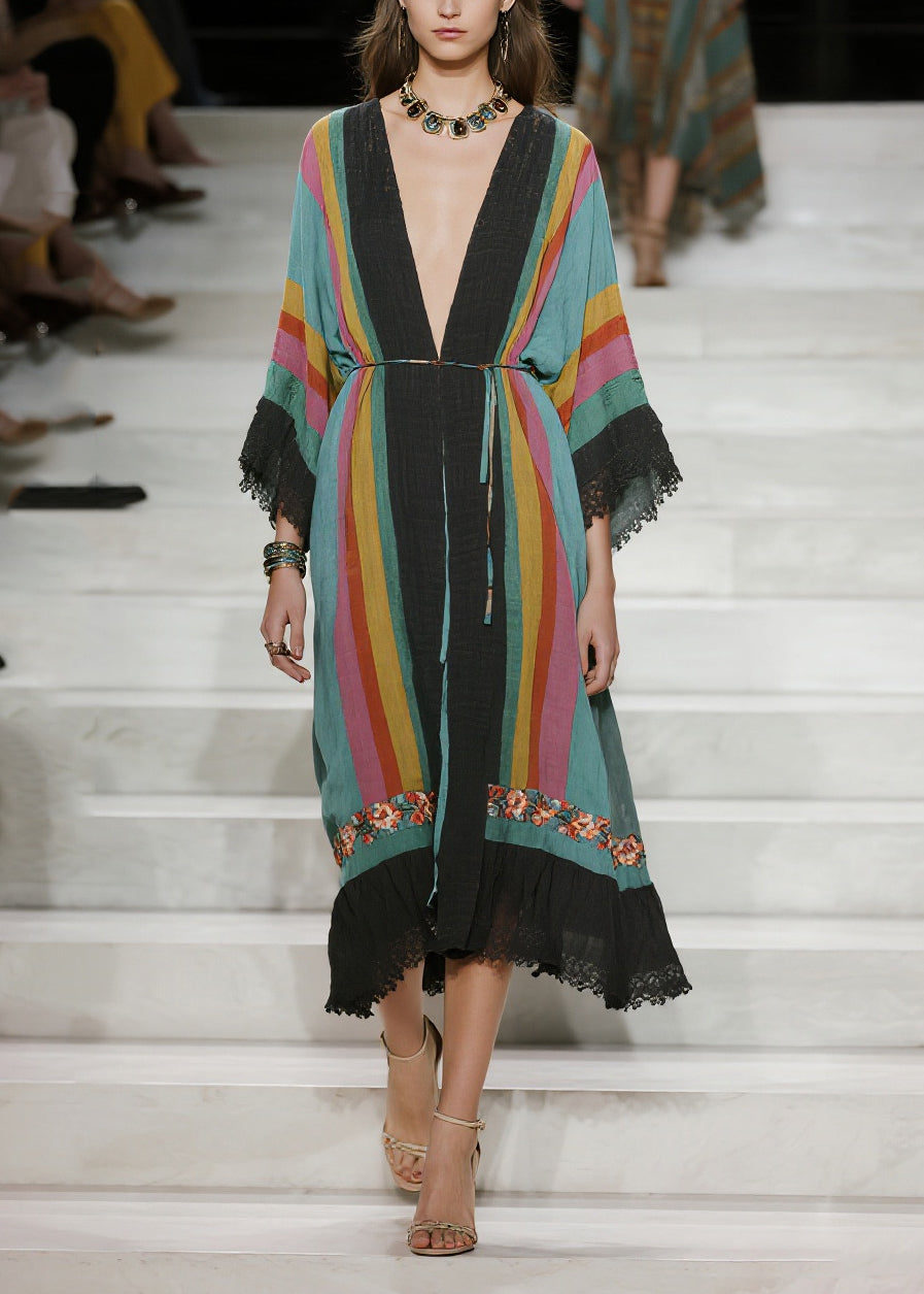 Unique Multicolored V Neck Lace Patchwork Cotton Dresses Summer