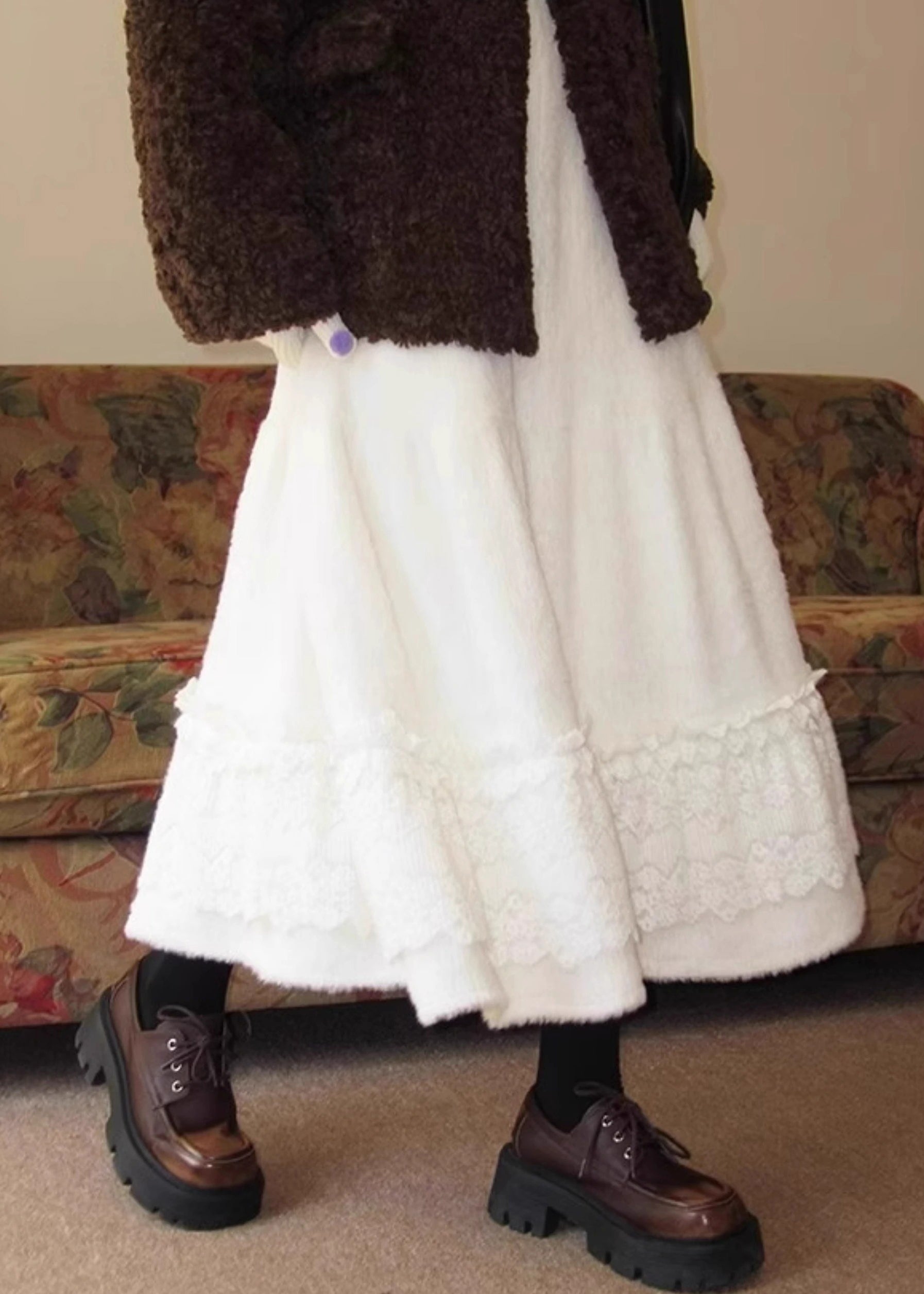 Simple Beige Lace Patchwork Elastic Waist Fluffy Skirt Winter