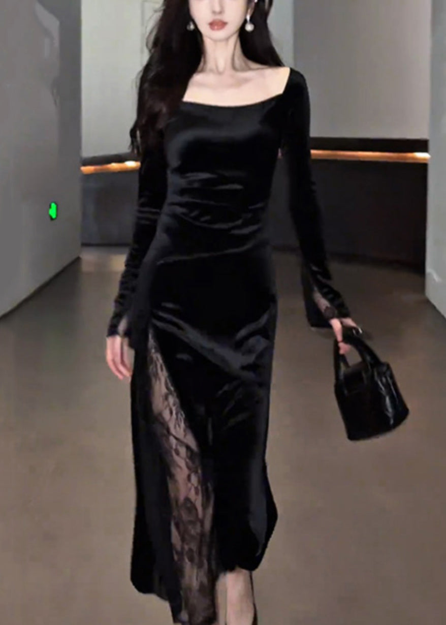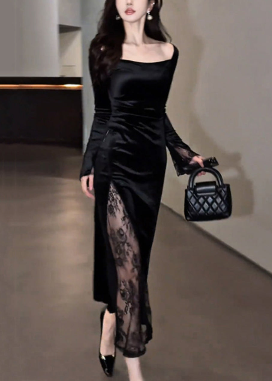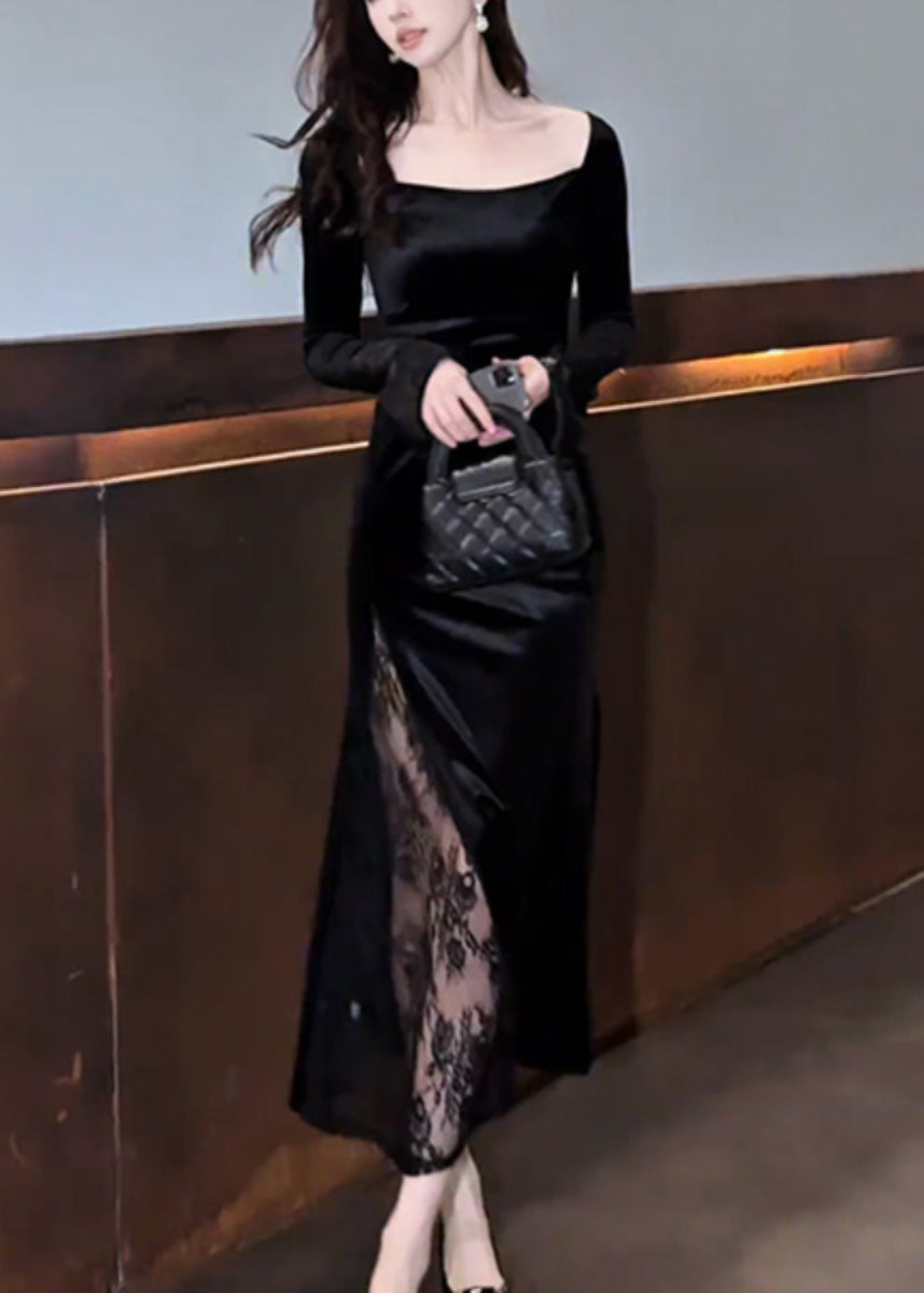 Slim Fit Black Square Collar Lace Patchwork Silk Velvet Long Dress Fall