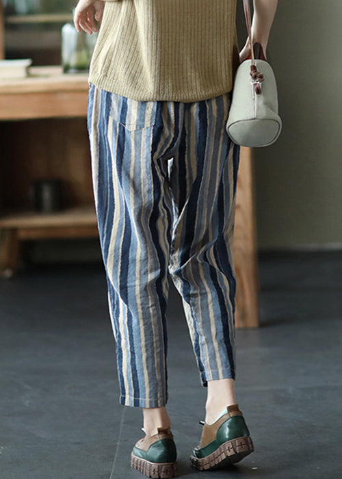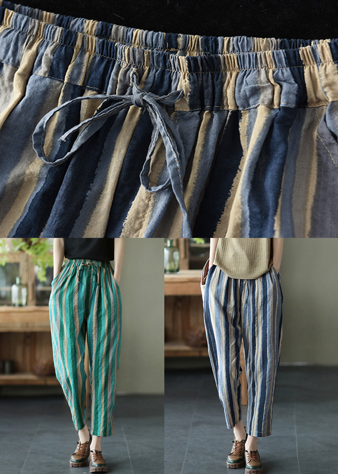 Blue Lace Up Pockets Cotton Crop Pants High Waist