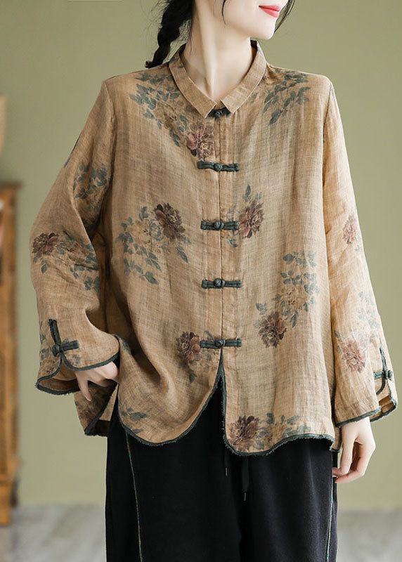 Plus Size Coffee Peter Pan Collar Print Button Shirt Fall